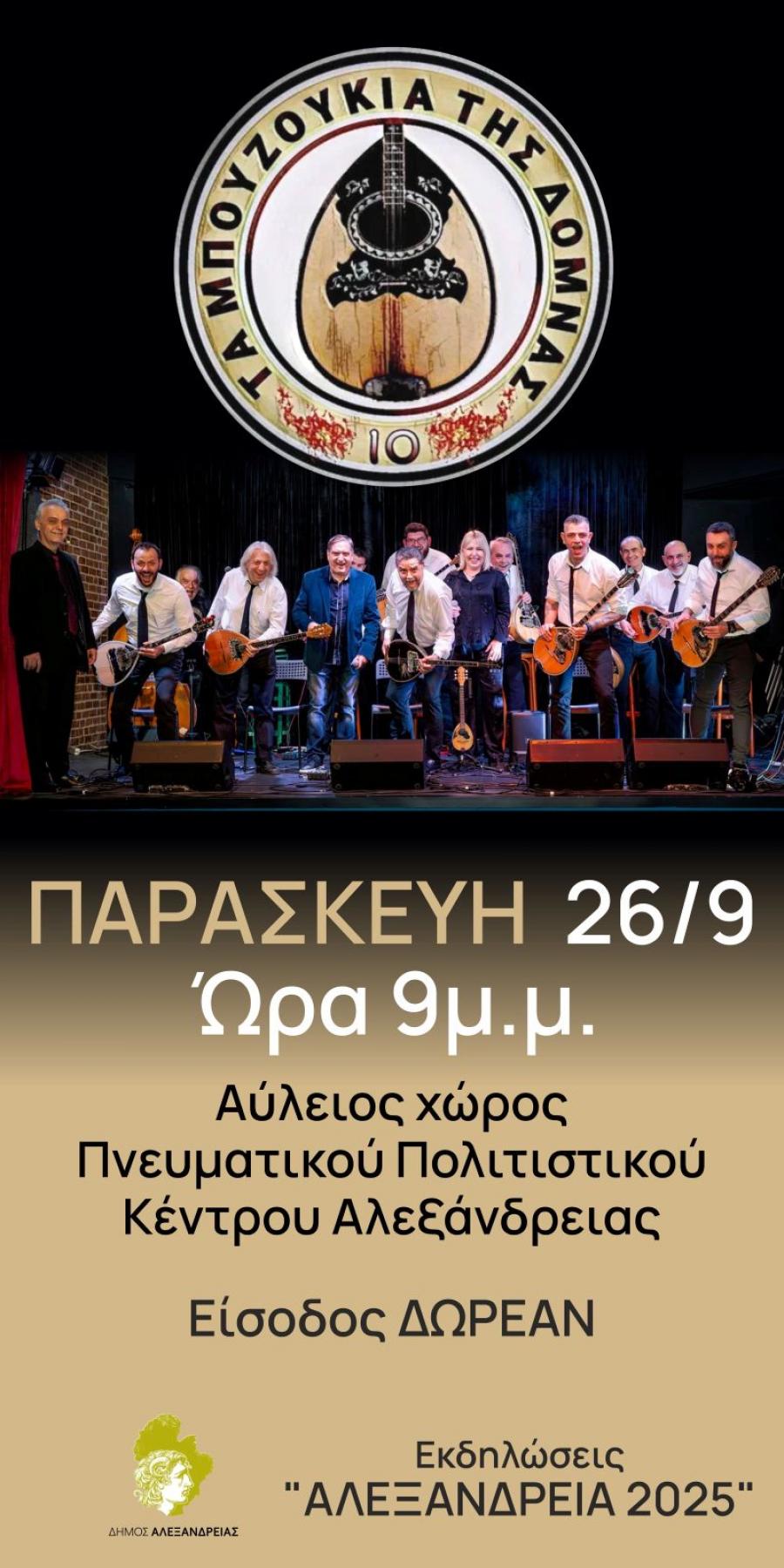Ο Δήμος Αλεξάνδρειας σας προσκαλεί την Παρασκευή 26 Σεπτεμβρίου 2025, ώρα 21.00 στον αύλειο χώρο του Πνευματικού Πολιτιστικού Κέντρου Αλεξάνδρειας στη μεγάλη λαϊκή συναυλία του φθινοπώρου!