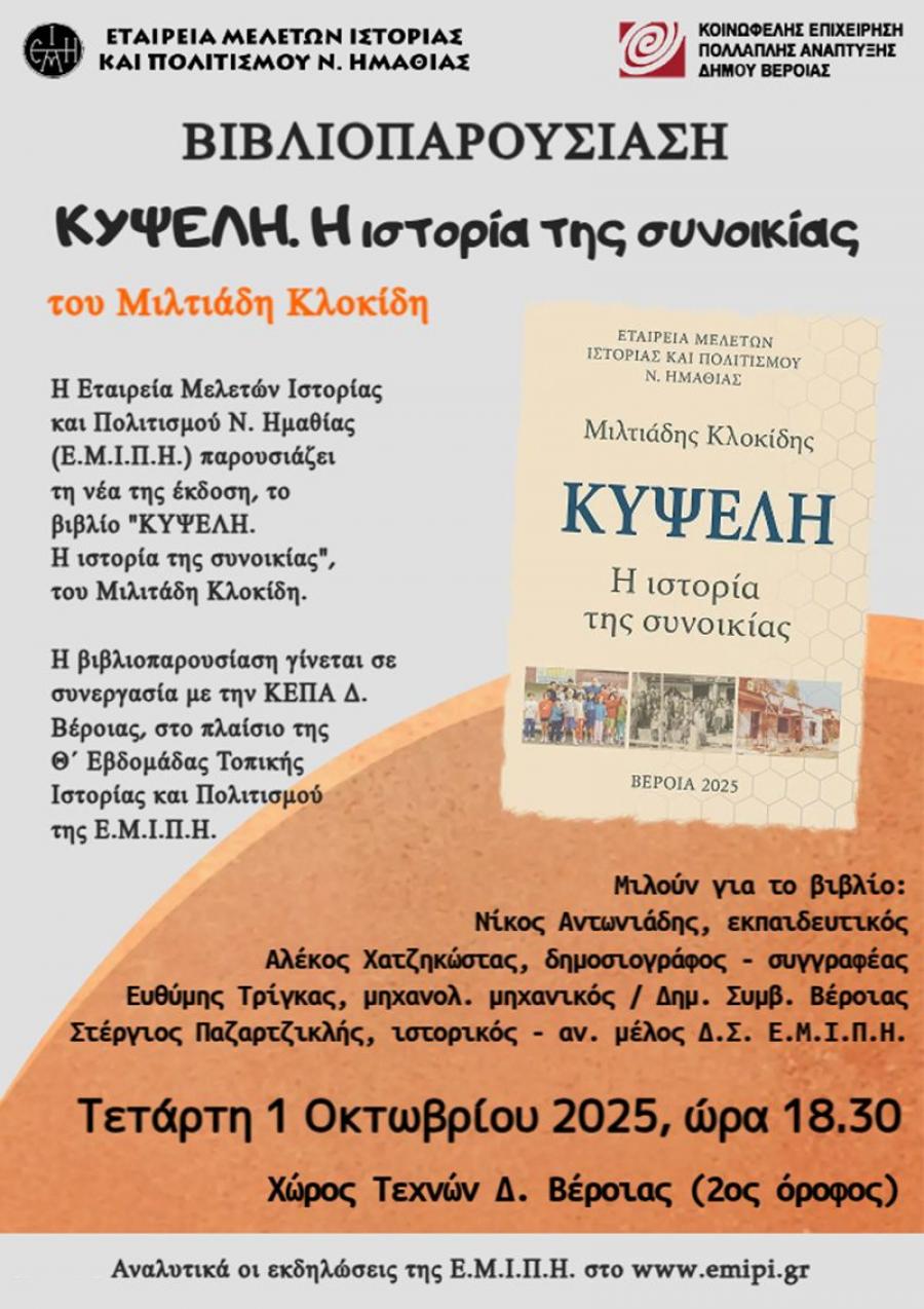 Η Εταιρεία Μελετών Ιστορίας και Πολιτισμού Ν. Ημαθίας (Ε.Μ.Ι.Π.Η.) παρουσιάζει τη νέα της έκδοση, το βιβλίο του Μιλτιάδη Κλοκίδη με τίτλο: «ΚΥΨΕΛΗ. Η ιστορία της συνοικίας».