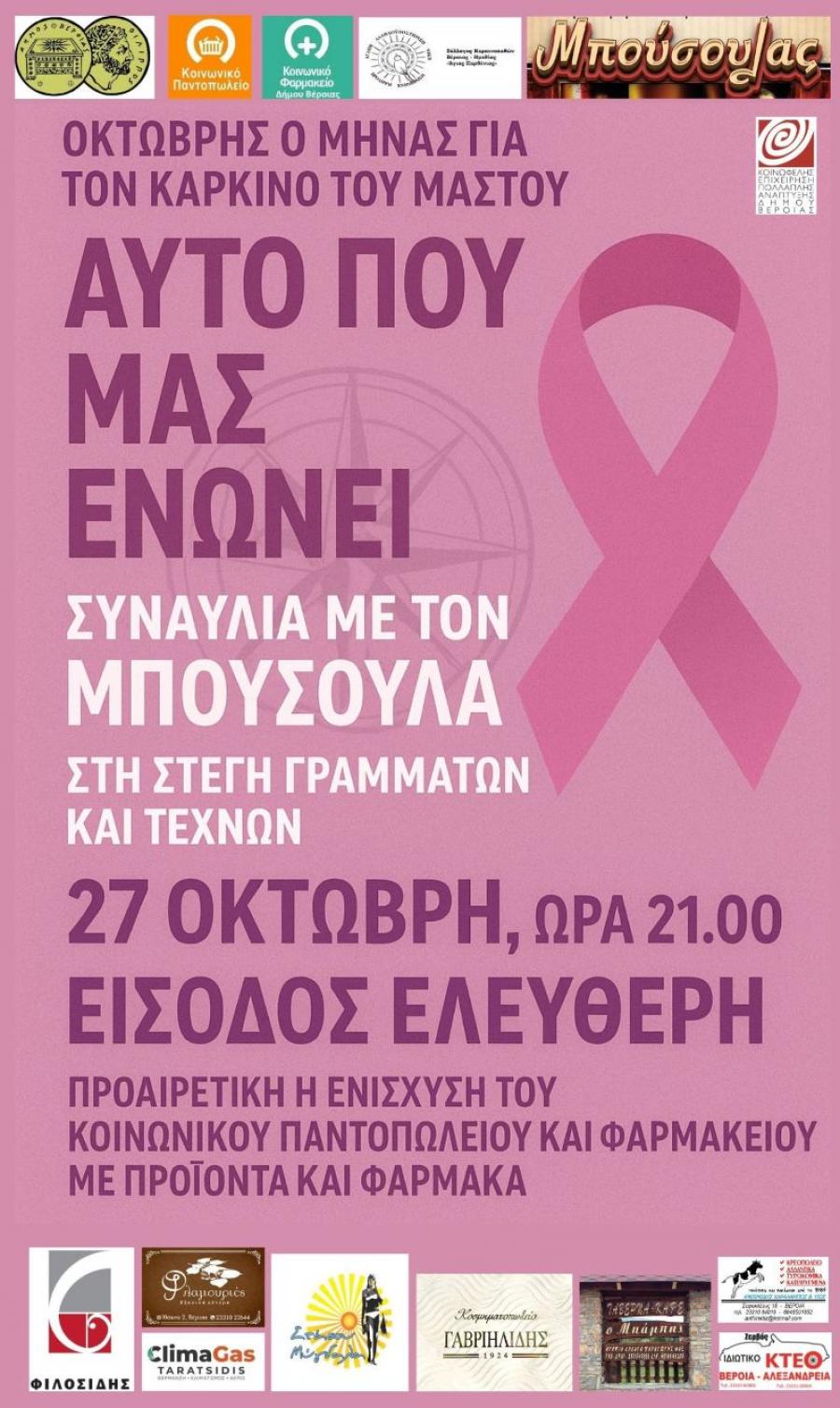 Το ΚΕΠ ΥΓΕΙΑΣ Δήμου Βέροιας, ο Σύλλογος Καρκινοπαθών «Ο ΑΓΙΟΣ ΠΑΡΘΕΝΙΟΣ» Ν. Ημαθίας και το μουσικό σχήμα «ΜΠΟΥΣΟΥΛΑΣ» με αφορμή τον «ΟΚΤΩΒΡΗ μήνας αφιερωμένος στον καρκίνο του μαστού» διοργανώνουν συναυλία αλληλεγγύης, που θα διεξαχθεί στην Στέγη Γραμμάτων & Τεχνών» την Δευτέρα 27 Οκτωβρίου 2025 και ώρα 21:00.