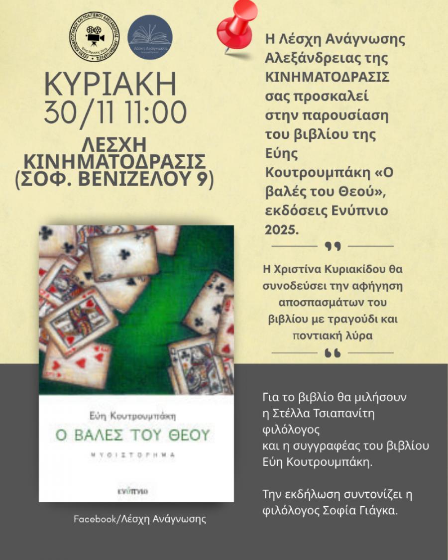 Η Λέσχη Ανάγνωσης Αλεξάνδρειας της Λέσχης Κινηματογράφου και Πολιτισμού Αλεξάνδρειας Κινηματόδρασις σας προσκαλεί την Κυριακή 30 Νοεμβρίου 2025 στις 11 π.μ στη Λέσχη μας (Σοφοκλή Βενιζέλου 9) στην παρουσίαση του βιβλίου της Εύης Κουτρουμπάκη «Ο βαλές του Θεού»,εκδόσεις Ενύπνιο 2025.