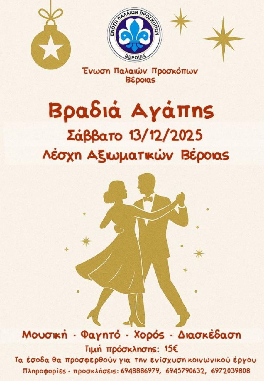 H Ένωση Παλαιών Προσκόπων Βέροιας, το Σάββατο 13 Δεκεμβρίου 2025 και ώρα 20:00μ.μ., διοργανώνει εορταστική βραδιά στον φιλόξενο χώρο της Λέσχης Αξιωματικών Βέροιας με τίτλο: «Βραδιά Αγάπης».