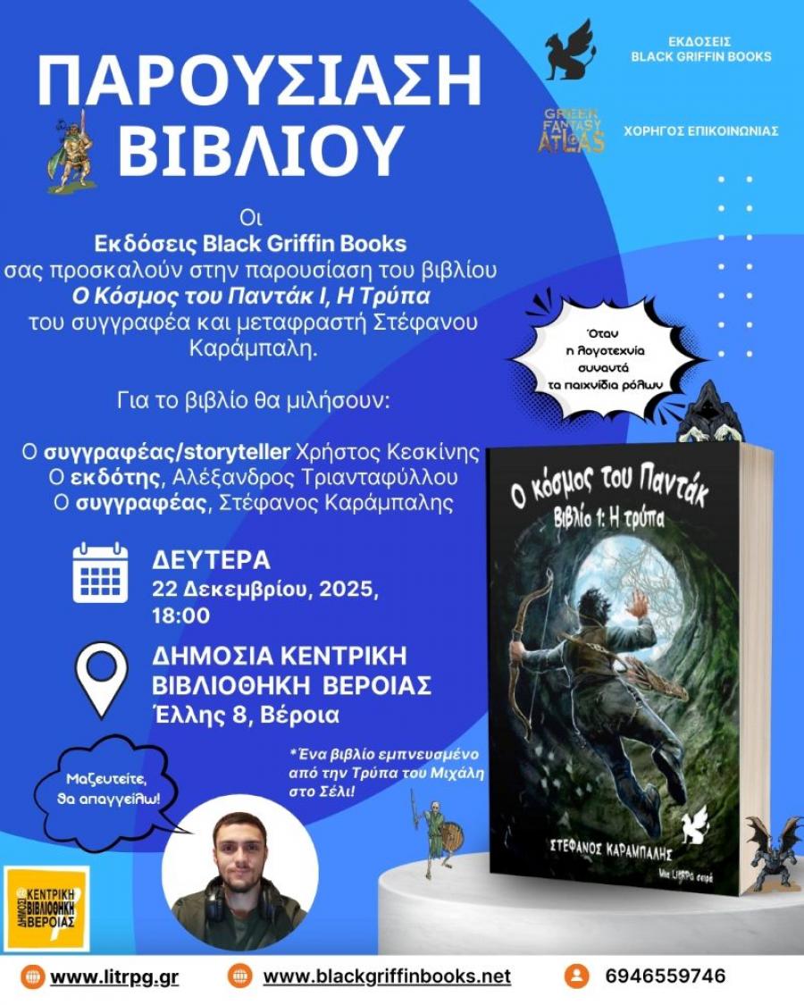 Ο εκδοτικός οίκος BlackGriffinBooksανακοινώνει με χαρά την κυκλοφορία του νέου βιβλίου “Ο Κόσμος του Παντάκ” του Στέφανου Καράμπαλη. Το βιβλίο θα παρουσιαστεί σε ειδική εκδήλωση στις 22/12/2025 και ώρα 18.00 στη Δημόσια Κεντρική Βιβλιοθήκη Βέροιας. Η είσοδος είναι ελεύθερη.