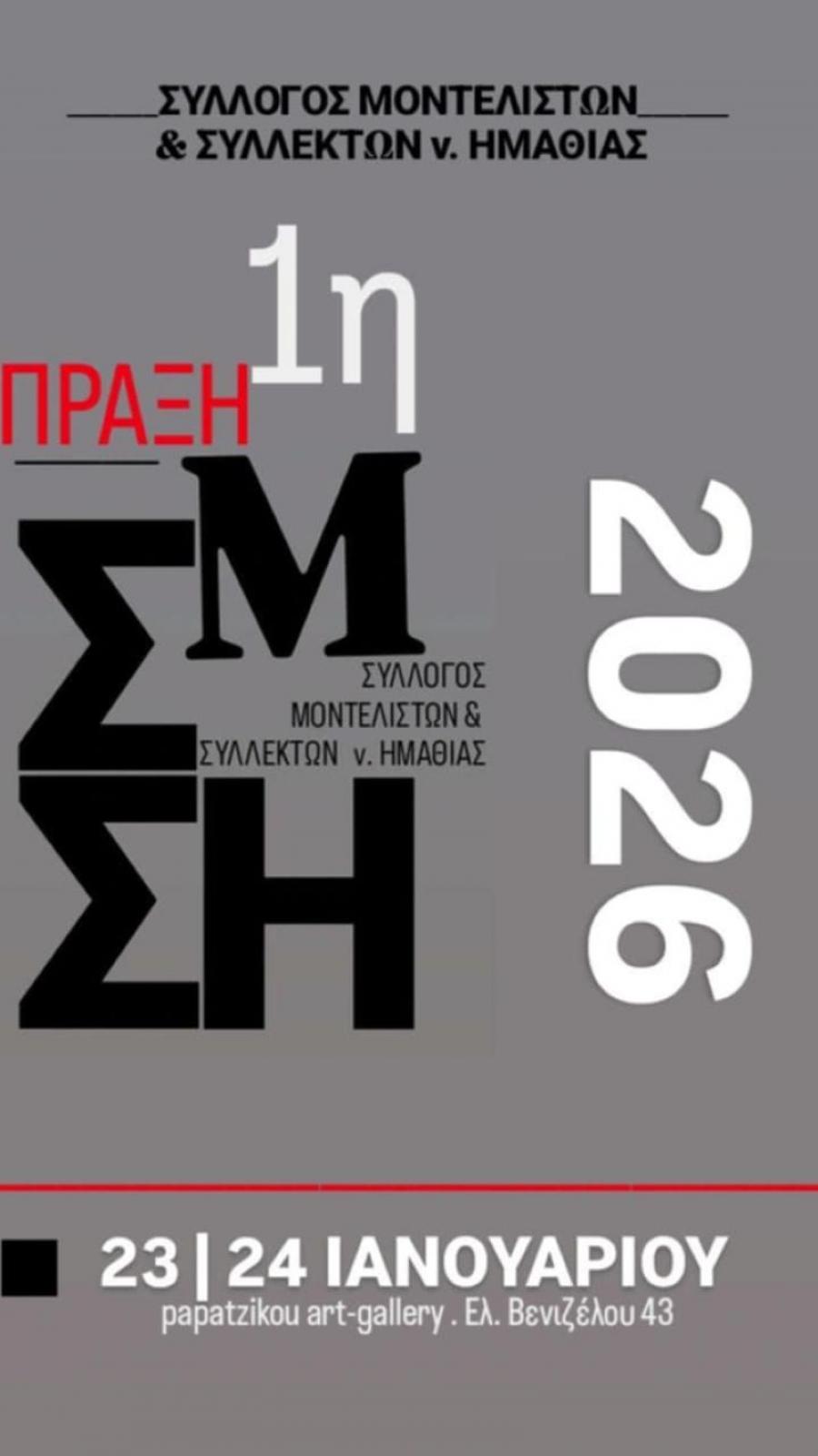 Ο Σύλλογος Μοντελιστών και Συλλεκτών ν. Ημαθίας, το διήμερο 24 & 25 Ιανουαρίου 2026, διοργανώνει την πρώτη του έκθεση «ΠΡΑΞΗ 1η», στην Γκαλερί Παπατζίκου, Ελ. Βενιζέλου 43 - Βέροια και σας προσκαλεί στα εγκαίνια της που θα πραγματοποιηθούν το Σάββατο 24 Ιανουαρίου, στις 18:30 το απόγευμα.