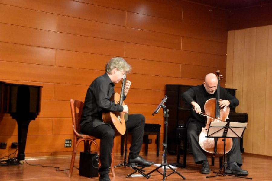 Οι δύο καταξιωμένοι καλλιτέχνες Δήμος Γκουνταρούλης (τσέλο) και Θάνος Μήτσαλας (κιθάρα) παρουσίασαν ένα υψηλού επιπέδου μουσικό πρόγραμμα, αναδεικνύοντας με ευρηματικό και καλλιτεχνικά άρτιο τρόπο τη σπάνια συνύπαρξη των δύο οργάνων. Μέσα από ευφάνταστες συνθέσεις και ερμηνείες υψηλής αισθητικής, κατάφεραν να αιχμαλωτίσουν το ενδιαφέρον και τις αισθήσεις του κοινού, το οποίο ανταποκρίθηκε με θερμό χειροκρότημα.