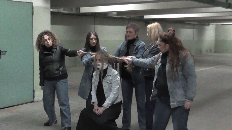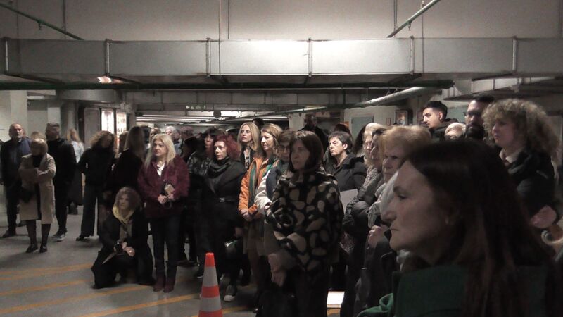 Ακολούθως στο Υπόγειο του Parkingτης Πλατείας Δημαρχείου, η Εικαστικός Κατερίνα Αναστασίου παρουσίασε το video art «κατάλοιπο» και την Performance«Πλεξούδες Σιωπής», διερευνώντας την κληρονομιά των έμφυλων ρόλων και τις κοινωνικές προσδοκίες που συνοδεύουν τη γυναίκα στον χρόνο. Μέσα από την επανάληψη μιας ατέρμονης χορογραφίας σε ένα οικείο αλλά κλειστοφοβικό περιβάλλον, κάθε κλωστή γίνεται υποχρέωση και κάθε πέτρα απαίτηση. Στα άνθη και τις πέτρες ο κόπος συσσωρεύεται, ενώ η πιθανότητα αποδέσμευσης εμφανίζεται διακριτικά, σαν μία ρωγμή που επιτρέπει στο νερό να κυλήσει ελεύθερο. Στις «Πλεξούδες Σιωπής», με ορατά σημάδια επιβολής και συλλογικής συμμετοχής στο πρόσωπο, το σώμα γίνεται πεδίο κοινωνικής κατασκευής και ελέγχου. Τα μακριά μαλλιά, σύμβολο ταυτότητας και θηλυκότητας, πλέκονται σφιχτά, παραπέμποντας στα διαχρονικά χτενίσματα, και στις αιώνιες απαιτήσεις για αξιοπρέπεια, ευπρέπεια και υποταγή των γυναικών. Μέσα από το πλέξιμο, ως χειρονομία πειθαρχίας, αποκαλύπτονται οι αόρατες κοινωνικές πιέσεις που περιορίζουν και διαμορφώνουν τη ζωή του σώματος. Στο δρώμενο συμμετείχαν οι: Αλεξάνδρα Γκίκα, Κατερίνα Γρηγοριάδου, Ελένη Ντόντου, Υακίνθη Σταμπολή, Γεωργία Ξενοφώντος, Ειρήνη Κουρκούλη και ο Βαγγέλης Τολίκας.