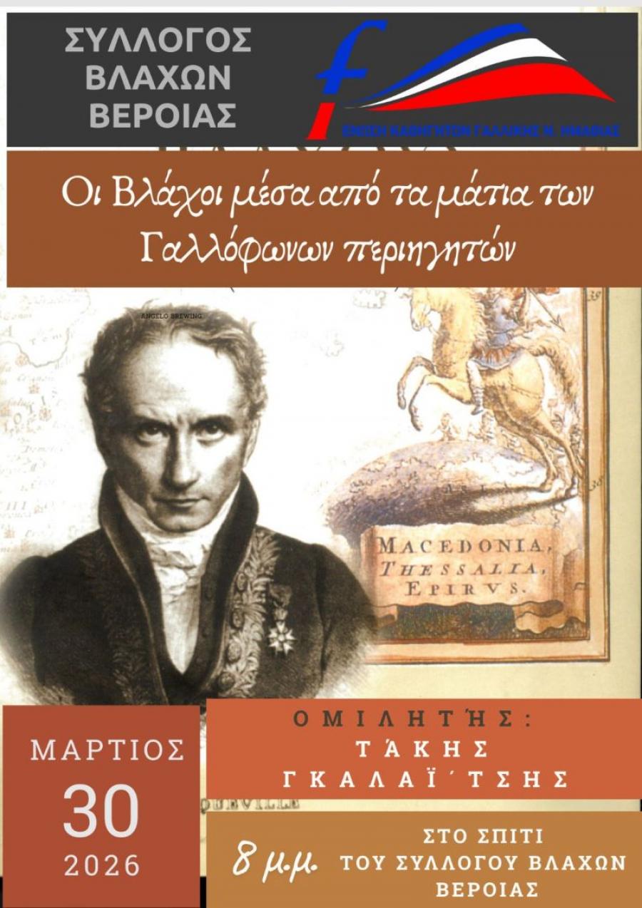 Ο Σύλλογος Βλάχων Βέροιας, σε συνεργασία με την Ένωση Καθηγητών Γαλλικής Ν. Ημαθίας, σας προσκαλεί σε μια ιδιαίτερα ενδιαφέρουσα εκδήλωση με θέμα: "Οι Βλάχοι μέσα από τα μάτια των Γαλλόφωνων περιηγητών"