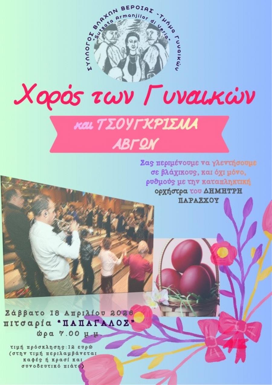 Με χαρά σάς ανακοινώνουμε ότι ο φετινός χορός των Γυναικών του Συλλόγου Βλάχων Βέροιας και το καθιερωμένο πασχαλινό «τσούγκρισμα των αβγών» θα