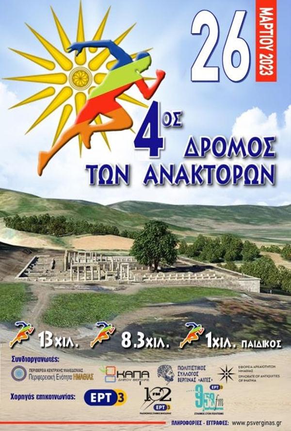 Με πολλές δεκάδες συμμετοχές, όλων των ηλικιών, έγινε σήμερα Κυριακή ο 4ος Δρόμων Ανακτόρων που διοργανώνει ο Πολιτιστιθκός Σύλλογος Βεργίνας "Αιγές", μαζί με την Περιφερειακή Ενότητα Ημαθίας και το ΚΑΠΑ Δήμου Βέροιας. Την εκκίνηση έδωσε ο Δήμαρχος Βέροιας Κώστας Βοργιαζίδης, ενώ παρέστησαν Αντιδήμαρχοι Βέροιας και εκπρόσωποι της Περιφερειακής Ενότητας Ημαθίας και εκτοντάδες θεατές που χειροκρότησαν τους συμμετέχοντες, που διαγωνίστηκαν σε τρεις κατηγορίες, στα 13 χλμ., στα 8.3 χλμ. και στα 1 χλμ..