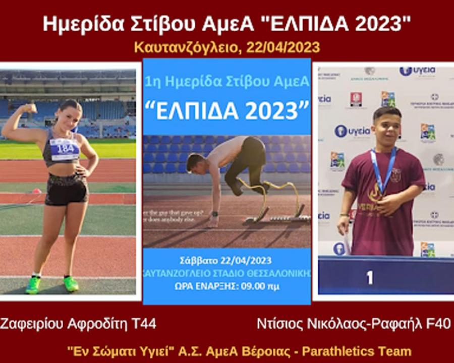 Ο Αθλητικός Σύλλογος ΑμεΑ ‘’ΕΛΠΙΔΑ’’ ΘΕΣΣΑΛΟΝΙΚΗΣ σε συνεργασία με το Δήμο Θεσσαλονίκης και την ΕΑΟΜ - ΑμεΑ διοργανώνει την 1η Ημερίδα Στίβου ΑμεΑ "ΕΛΠΙΔΑ 2023" στο Καυτανζόγλειο Εθνικό Στάδιο Θεσσαλονίκης στις 22 Aπριλίου 2023. Οι αγώνες διεξάγονται, υπό την αιγίδα της Ελληνικής Παραολυμπιακής Επιτροπής και την υποστήριξη της Περιφέρειας Κεντρικής Μακεδονίας. Θα συμμετέχουν αθλητές από όλη την Ελλάδα, μεγάλα αστέρια του Ελληνικού Παραολυμπιακού Αθλητισμού, που θα δώσουν τον καλύτερό τους εαυτό για να πετύχουν τα όρια για τις μεγάλες διεθνείς διοργανώσεις του Παγκοσμίου Πρωταθλήματος Στίβου 2023 και των Παραολυμπιακών Αγώνων Paris 2024.