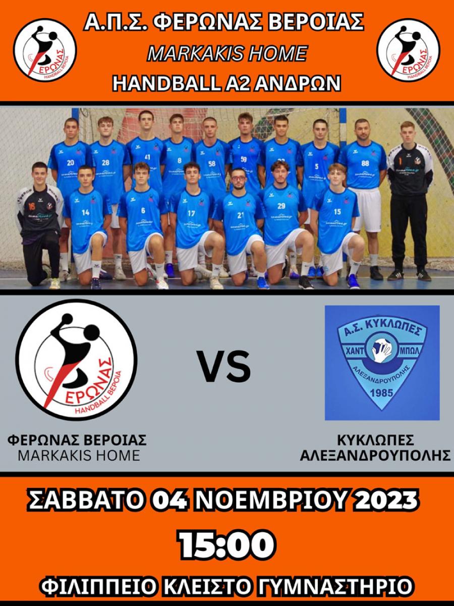 Πρώτος εντός έδρας αγώνας για την ομάδα του Φέρωνα Βέροιας η οποία υποδέχεται το Σάββατο 4 Νοεμβρίου 2023 στις 15:00 στο Φιλιππειο Κλειστό Γυμναστήριο τους Κύκλωπες Αλεξανδρούπολης στα πλαίσια της 3ης Αγωνιστικής του Βορείου Ομίλου της Α2 Ανδρών.