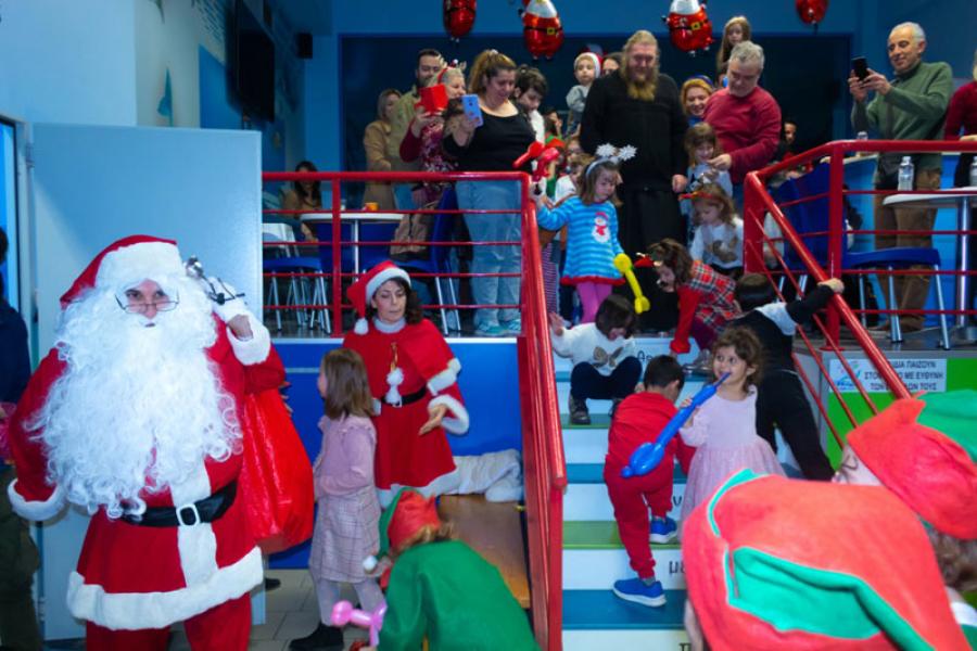 Και ενώ όλοι ήταν απασχολημένοι, …ακούστηκε το κουδουνάκι του Άγιου Βασίλη. Χωρίς δεύτερη σκέψη όλα τα παιδιά έτρεξαν στην πισίνα. Το νερό της πισίνας ήταν ταραγμένο και ξαφνικά μέσα από το νερό ¨βγήκε ο Άγιος Βασίλης¨ φωνάζοντας χο,χο,χο και χαιρετώντας τα παιδιά που τον κοιτούσαν αποσβολωμένα. Πριν καλά-καλά συνειδητοποιήσουν τί είχε συμβεί, ο Άγιος Βασίλης βγήκε από την πισίνα, πήρε τον σάκο με τα δώρα και ήρθε κοντά στα παιδιά. Αφού τα γέμισε με καραμέλες και άλλες λιχουδιές, έκατσε στην αναπαυτική του πολυθρόνα, δίπλα στο δέντρο, πήρε αγκαλιά ένα-ένα όλα τα παιδιά και τους μοίρασε τα δώρα. Βγήκε φωτογραφίες μαζί τους και σε κάθε παιδάκι έδωσε και μια συμβουλή για τη νέα χρονιά.