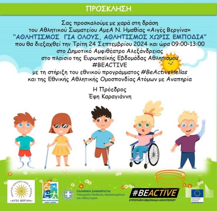 Στο πλαίσιο της Ευρωπαϊκής Εβδομάδας Αθλητισμού #BeActive το Αθλητικό Σωματείο ΑμεΑ Ν. Ημαθίας ΑΙΓΕΣ ΒΕΡΓΙΝΑ διοργανώνει σε συνεργασία με το BeActive Hellas και την στήριξη της Εθνικής Αθλητικής Ομοσπονδίας ΑμεΑ επιδείξεις παραολυμπιακών αθλημάτων και βιωματικές δράσεις την Τρίτη 24/9/2024, στο Δημοτικό Αμφιθέατρο Αλεξάνδρειας από τις 9:00 πμ έως τις 13:30 μμ.