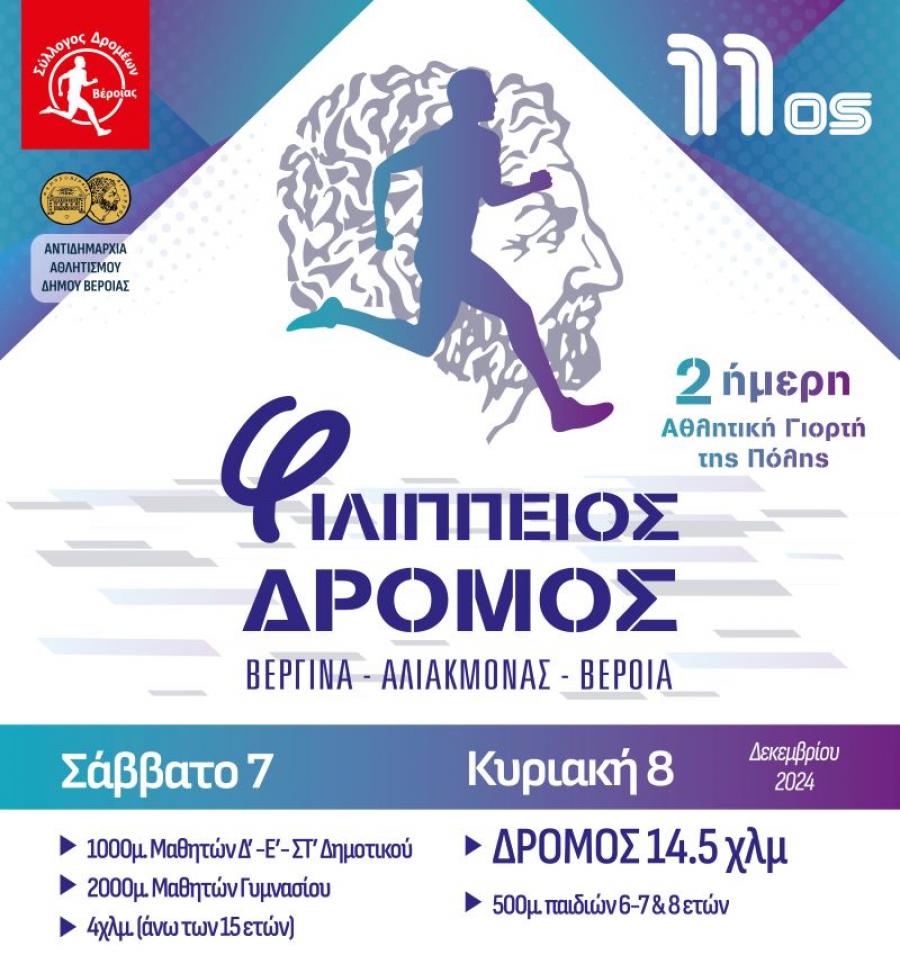 Ο Σύλλογος δρομέων Βέροιας και η Αντιδημαρχία Αθλητισμού του Δήμου Βέροιας, ανακοινώνουν την ημερομηνία διεξαγωγής του λαϊκού αγώνα δρόμου ΄΄11ος ΦΙΛΙΠΠΕΙΟΣ ΔΡΟΜΟΣ 14.5χλμ ΄΄, την Κυριακή 8 Δεκεμβρίου 2024 και τους παράλληλους νυχτερινους αγώνες (4χλμ άνω των 15 ετών - 2χλμ γυμνασίων – 1χλμ Δημοτικού) που θα διεξαχθούν το Σάββατο 7 Δεκεμβρίου 2024.