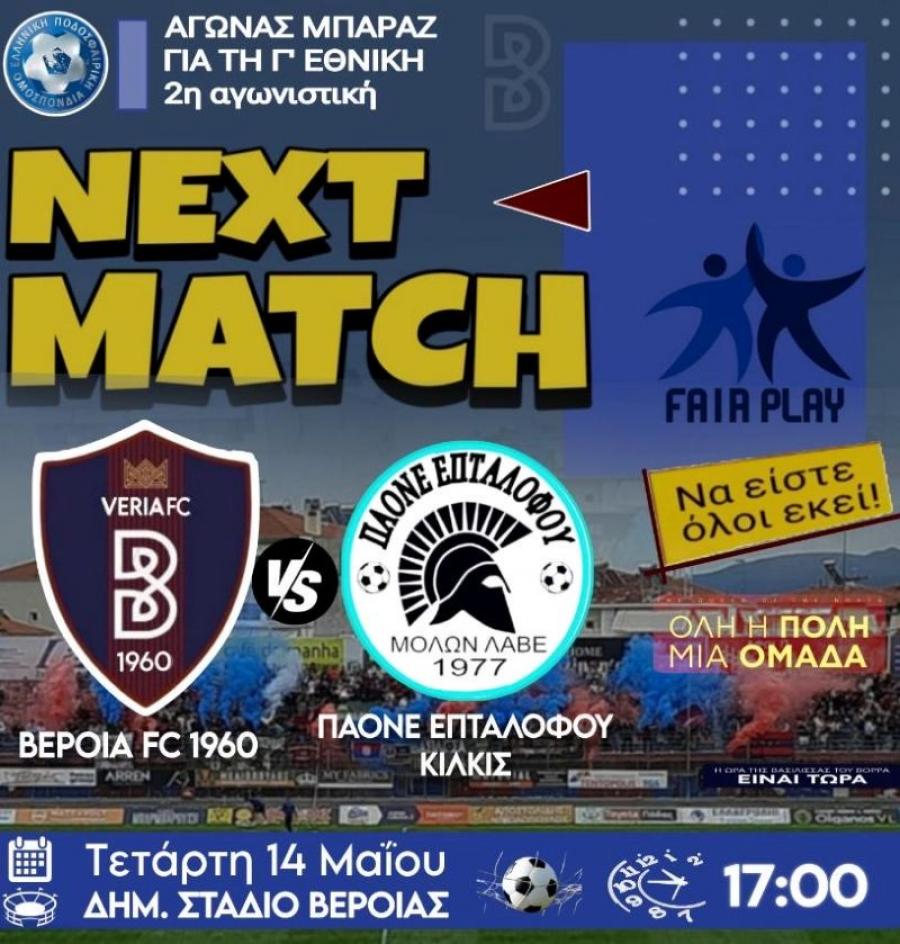 Η δεύτερη αγωνιστική των αγώνων μπαράζ για την άνοδο στην Γ΄ Εθνική θα διεξαχθεί αύριο Τετάρτη στις 5 το απόγευμα. Η Βέροια θέλει να κάνει το δύο στα δύο και να βάλει βάσεις για την μία από τις τρεις προνομιούχες θέσεις που οδηγούν απευθείας στην παραπάνω κατηγορία. Η "βασίλισσα" θα υποδεχθεί στο δημοτικό στάδιο της πόλης τον ΠΑΟΝΕ Επταλόφου Κιλκίς και οι ποδοσφαιριστές, τεχνική ηγεσία και διοίκηση καλούν τους φιλάθλους να παραβρεθούν στην αυριανή αναμέτρηση και να συμπαρασταθούν στις προσπάθειες για την κατάκτηση της δεύτερης συνεχόμενης νίκης.