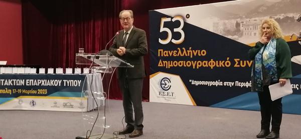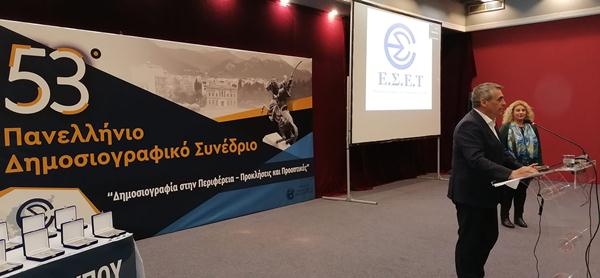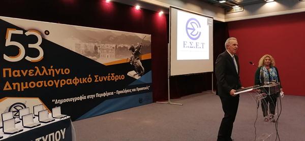 Την πανηγυρική έναρξη του 53ου Πανελλήνιου Δημοσιογραφικού Συνεδρίου έκανε, με ομιλία του ο Πρόεδρος του Δ.Σ. της ΕΣΕΤ κος Γεώργιος Κουλουράς, ο οποίος αφού ευχαρίστησε όλους τους φορείς που συνεργάστηκαν και συνέδραμαν στην πραγματοποίηση του Συνεδρίου επεσήμανε πως «Η Ένωση Συντακτών Επαρχιακού δεν είναι ο Πρόεδρος της. Η Ένωση μας είναι όλοι οι δημοσιογράφοι σε κάθε γωνιά της χώρας. Αυτό που ξεχωρίζει στα μέλη μας είναι το ήθος τους, οι αρχές που πρεσβεύουν και η αγάπη για τη δημοσιογραφία. Κάθε φορά δεν έχουμε καλό η καλύτερο κομμάτι του εαυτού μας για να δώσουμε. Κάθε φορά καταθέτουμε την ψυχή μας», καταλήγοντας και τονίζοντας πως «Η έγκυρη και αξιόπιστη ενημέρωση είναι απαραίτητη προϋπόθεση για έναν εποικοδομητικό και αποτελεσματικό δημόσιο διάλογο. Σεβόμενοι τις αρχές της Δημοκρατίας, του Κράτους Δικαίου, αλλά και τους κανόνες δεοντολογίας της δημοσιογραφίας, ενισχύουμε τους δεσμούς μας με την κοινωνία. Τα Περιφερειακά Μέσα Ενημέρωσης είναι οι φορείς ενημέρωσης για τα δρώμενα στις τοπικές κοινωνίες. Έχουν αναδειχθεί σε μέσα προβολής των προβλημάτων αλλά και των λύσεων και δίνουν χώρο στις απόψεις των τοπικών φορέων. Προβάλλουν τα επιτεύγματα του τοπικού επαγγελματικού και επιχειρηματικού δυναμικού, την ιδιαίτερη πνευματική, ιστορική και πολιτιστική κληρονομιά. Έτσι αναδεικνύουν την ιδιαίτερη ταυτότητα του κάθε τόπου. Είναι ένα βήμα διαλόγου, αντιπαράθεσης και κατάθεσης προτάσεων και ουσιαστικά αποτελούν μετερίζια της Δημοκρατίας..».