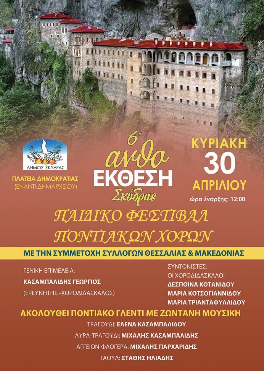 Στο πλαίσιο της 6ης Ανθοέκθεσης ο Δήμος Σκύδρας διοργανώνει Παιδικό Φεστιβάλ Ποντιακών χορών με τη συμμετοχή τοπικών Ποντιακών Συλλόγων και Συλλόγων από Θεσσαλία και Μακεδονία.