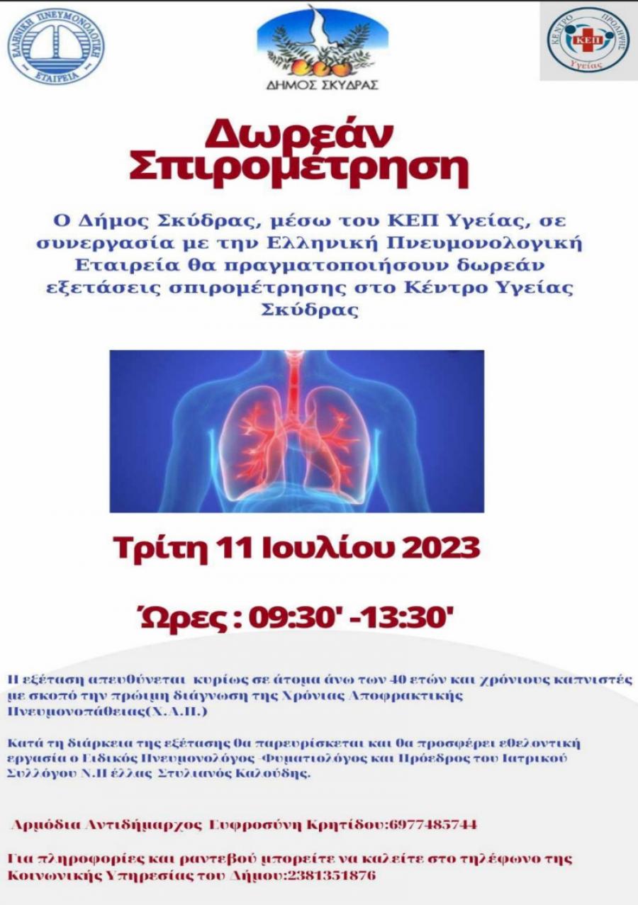 Ο Δήμος Σκύδρας, στο πλαίσιο των συνεχιζόμενων πρωτοβουλιών και δράσεών του για την αύξηση της εφαρμογής μέτρων πρόληψης και προστασίας της δημόσιας υγείας, θα πραγματοποιήσει πρόγραμμα δωρεάν εξετάσεων σπιρομέτρησης.