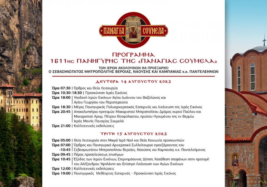 Tο Πανελλήνιο Ιερό Προσκύνημα και το Σωματείο «Παναγία Σουμελά» διοργανώνουν στην Καστανιά Ημαθίας, την Δευτέρα 14 και την Τρίτη 15 Αυγούστου 2023 την 1611η Πανηγυρική Εορτή του Δεκαπενταυγούστου, η οποία αποτελεί συνέχεια της Eθνικό-θρησκευτικής παράδοσης του Ελληνισμού στον Αλησμόνητο Πόντο.
