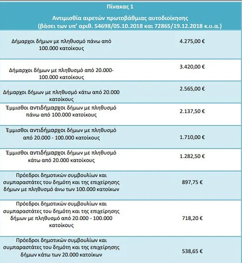 Ανάλογα του πληθυσμού του κάθε δήμου, κυμαίνονται τα ποσά με τα οποία αμείβονται οι δήμαρχοι, αντιδήμαρχοι και πρόεδροι δημοτικών συμβουλίων και επιχειρήσεων.