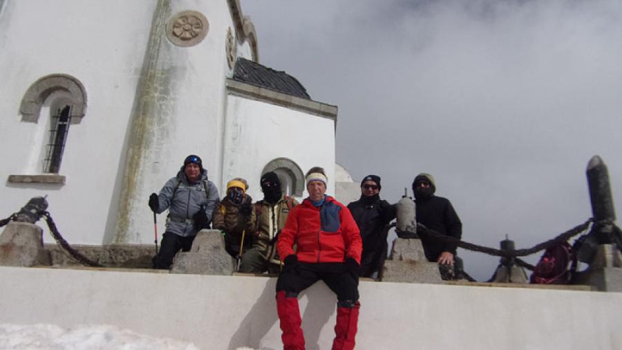 Τώρα άγρια μουσική αέρα ανακατεμένη με χιόνι παγωμένο μας μαστιγώνει το πρόσωπο μπήκαμε μέσα στο εκκλησάκι του Προφήτη Ηλία ανάψαμε ένα κερί , γύρω από το ιερό στεφάνια με πλαστικά λουλούδια γραμμένα στα σλάβικα αφιερωμένα στην χάρη του Αγίου από τους φίλους Σκοπιανούς .