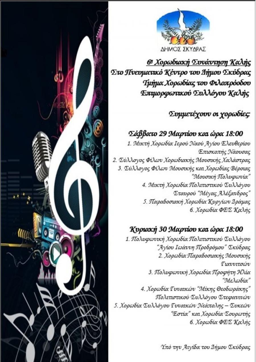 Έτσι λοιπόν και φέτος δώδεκα χορωδίες πολιτιστικών συλλόγων της χώρας συνεργάζονται κι εμφανίζονται στη σκηνή του Πνευματικού Κέντρου Σκύδρας, το Σάββατο 29 και την Κυριακή 30 Μαρτίου 2025 (ώρα 18:00΄) στο πλαίσιο της 6ης Χορωδιακής Συνάντησης Καλής Δήμου Σκύδρας.