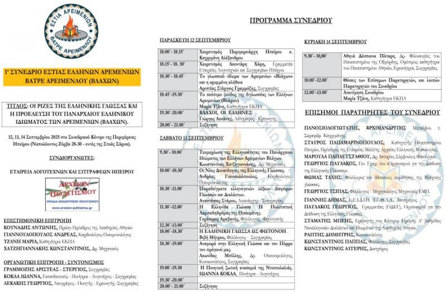 «Οι ρίζες της Ελληνικής Γλώσσας και η προέλευση του πανάρχαιου ελληνικού ιδιώματος των Ελλήνων Αρειμενίων (Βλάχων)» και θα διεξαχθεί στις 12, 13 και 14 Σεπτεμβρίου, στο Συνεδριακό Κέντρο της Περιφέρειας Ηπείρου, επί της οδού Ναπολέοντος Ζέρβα 28-30, στα Ιωάννινα.