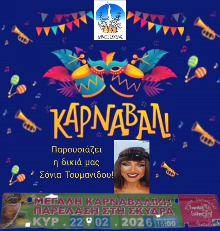 To ταξίδι της πολιτιστικής παράδοσης και του κεφιού συνεχίζεται με τις γιορτινές εκδηλώσεις του Σκυδραϊκού Καρναβαλιού που κορυφώνονται με τη Μεγάλη Καρναβαλική Παρέλαση, την Κυριακή 22 Φεβρουαρίου 2026 κι ώρα 16:00΄.