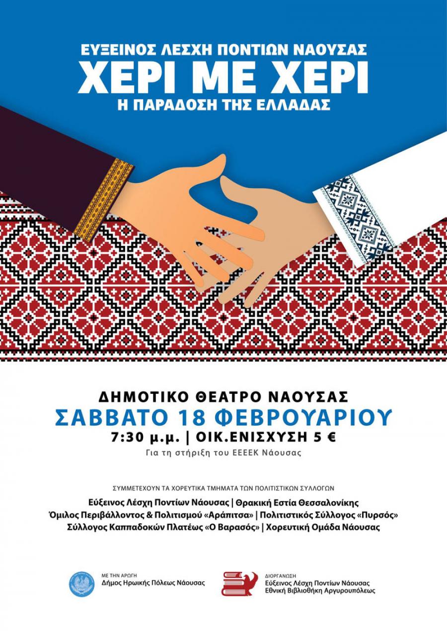 Η Εύξεινος Λέσχη Ποντίων Νάουσας – Εθνική Βιβλιοθήκη Αργυρουπόλεως «Ο Κυριακίδης» διοργανώνει για 5η χρονιά την μουσικοχορευτική παράσταση, φιλανθρωπικού χαρακτήρα, με τίτλο «ΧΕΡΙ ΜΕ ΧΕΡΙ, η παράδοση της Ελλάδας», η οποία θα πραγματοποιηθεί το Σάββατο 18 Φεβρουαρίου 2023 και ώρα 7:30 μ.μ. στο Δημοτικό Θέατρο Νάουσας. Η φετινή διοργάνωση πραγματοποιείται για τη στήριξη του ΕΕΕΕΚ Νάουσας.
