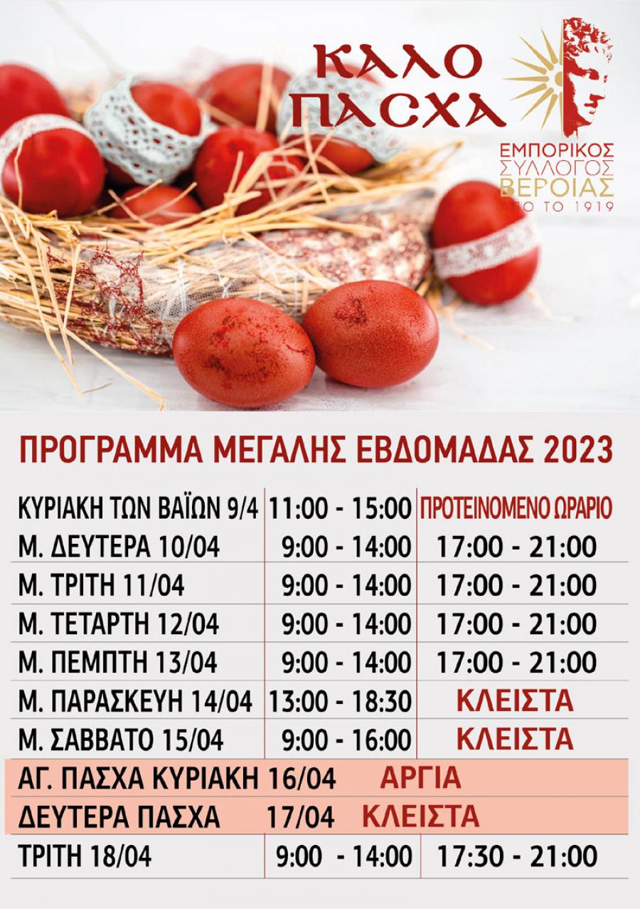 Από τη Μεγάλη Δευτέρα 10 Απριλίου τίθεται σε ισχύ το πασχαλινό ωράριο στα εμπορικά καταστήματα της Βέροιας, το οποίο θα διαρκέσει μέχρι και το Μεγάλο Σάββατο. Στο Πλαίσιο του εορταστικού ωραρίου ο Εμπορικός Σύλλογος Βέροιας ανακοίνωσε, το προτεινόμενο ωράριο λειτουργίας των καταστημάτων για την Κυριακή των Βαϊών 9 Απριλίου, από τις 11:00 έως τις 15:00.