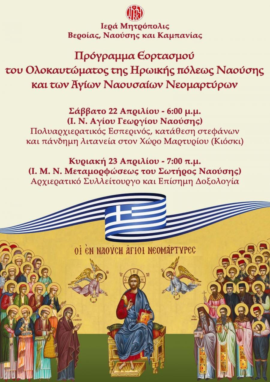 Η Hρωική και Aγιοτόκος πόλη της Ναούσης εορτάζει και τιμά, όπως κάθε χρόνο, την Κυριακή του Θωμά το ολοκαύτωμα της πόλεως και τη θυσία των 1241 Ναουσαίων Νεομαρτύρων. Ως εκ τούτου ο Ποιμενάρχης μας, Σεβασμιώτατος Μητροπολίτης Βεροίας, Ναούσης και Καμπανίας κ. Παντελεήμων, καλεί κλήρο και λαό να συμμετέχουμε ενεργά στις παρακάτω λατρευτικές εκδηλώσεις: