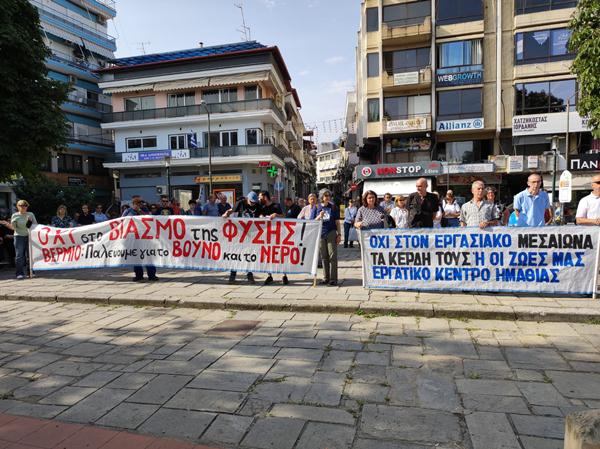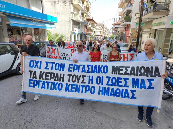 Ενώ την κεντρική ομιλία έκανε η Χρυσάνθη Μπόλα αντιπρόεδρος του σωματείου ιδιωτικών υπαλλήλων Ημαθίας – Πέλλας και μέλος του ΔΣ του Εργατικού Κέντρου Ημαθίας “Γεώργιος Βουτυράς”. Καταδικάζοντας τον αντεργατικό “έκτρωμα” και τονίζοντας ότι στον πόλεμο που μας κήρυξαν απαντάμε με πόλεμο και θα δώσουμε όλες μας τις δυνάμεις στην μάχη για να καταστήσουμε αυτό τον νόμο ανενεργό. Ακολούθησε πορεία στους δρόμους της πόλης.