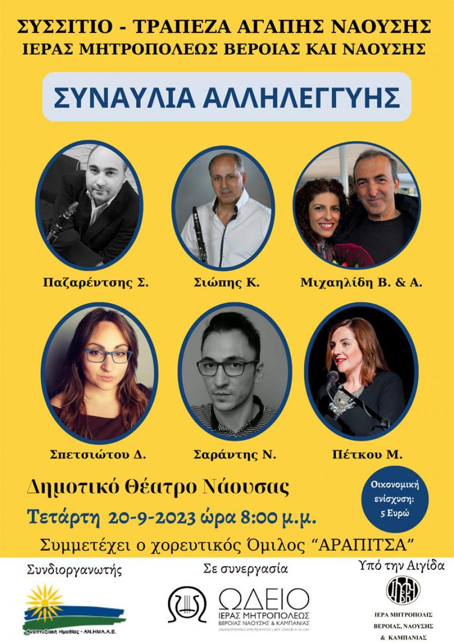 Την Τετάρτη 20 Σεπτεμβρίου 2023 και ώρα 8:00 μ.μ. στο θερινό Δημοτικό Θέατρο με την παρουσία των αρχών και πλήθος κόσμου, πραγματοποιήθηκε από το Συσσίτιο - Τράπεζα Αγάπης Ναούσης της Ιεράς Μητροπόλεως μας, η Συναυλία Αλληλεγγύης σε συνεργασία με την ΑΝΗΜΑ Α.Ε. και το Ωδείο της Ιεράς Μητροπόλεως και υπό την αιγίδα της Ιεράς Μητροπόλεως Βεροίας, Ναούσης και Καμπανίας, με σκοπό την ενίσχυση του Συσσιτίου μας.