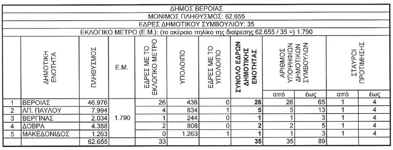 35 μέλη, σε δήμους με πληθυσμό 50.001 - 100.000 κατοίκων, στην οποία ανήκει ο Δήμος Βέροιας με απογραφικό πληθυσμό 62.655 κατοίκους. Στον Δήμο Βέροιας ο συνδυασμός που θα εκλεγεί με το οριακό ποσοστό του 43% + 1 ψήφο, θα εκλέξει 21 δημοτικούς συμβούλους και οι υπόλοιποι 14 σύμβουλοι θα κατανεμηθούν ανάλογα με τα ποσοστά που θα πάρουν οι άλλοι τρεις συνδυασμοί.