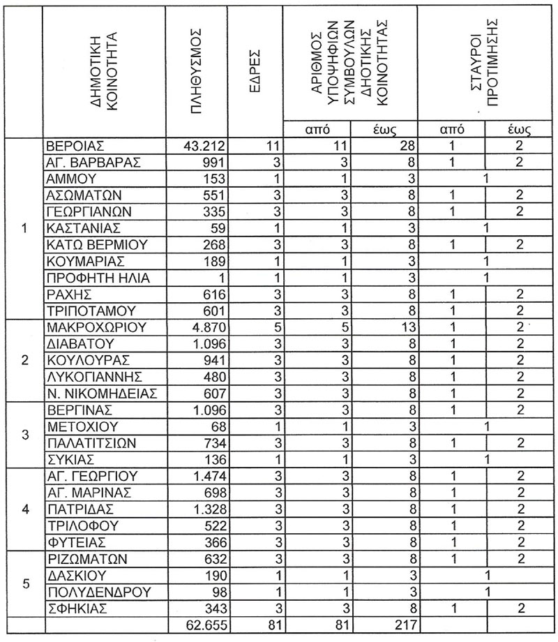 Έτσι από τους 41 δημοτικούς συμβούλους, επιπλέον τον Δήμαρχο, που έχει σήμερα το Δημοτικό Συμβούλιο Βέροιας, από τη νέα θητεία θα έχει 35 δημοτικούς συμβούλους, επιπλέον τον Δήμαρχο. Όσον αφορά τις έδρες στης Ημαθίας στο Περιφερειακό Συμβούλιο Κεντρικής Μακεδονίας, παραμένουν πέντε (5).