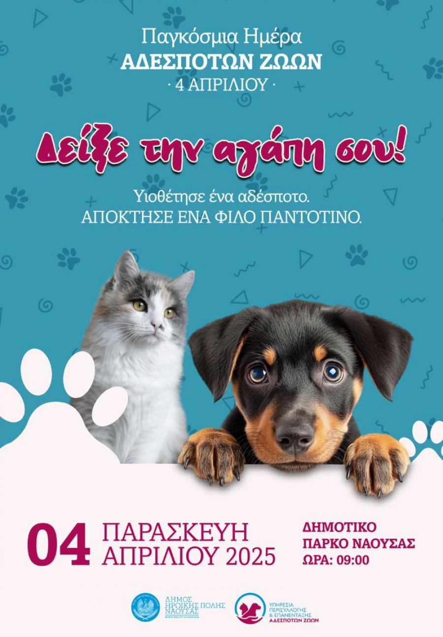 Δράση στο πλαίσιο της Παγκόσμιας Ημέρας Αδέσποτων Ζώων, θα πραγματοποιήσει το πρωί της Παρασκευής 4 Απριλίου 2025, ο Δήμος Ηρωικής Πόλεως Νάουσας, η Αντιδημαρχία Καθαριότητας, Περιβάλλοντος και Δημοτικής Αστυνομίας και ο αρμόδιος Αντιδήμαρχος κ. Γρηγόρης Σαμαράς, σε συνεργασία με την Φιλοζωική Νάουσας.