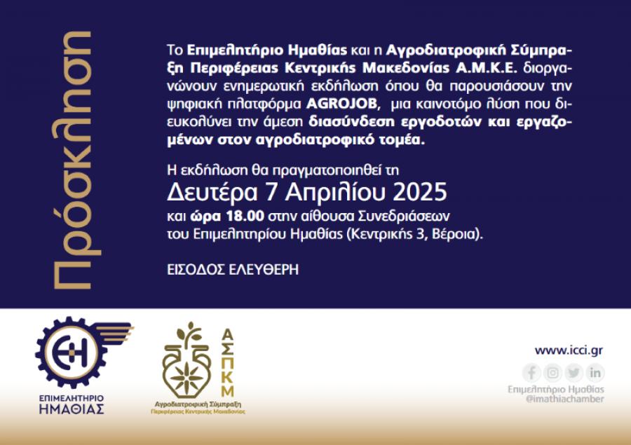 Το Επιμελητήριο Ημαθίας σε συνεργασία με την Αγροδιατροφική Σύμπραξη της Περιφέρειας Κεντρικής Μακεδονίας Α.Μ.Κ.Ε. διοργανώνουν ενημερωτική εκδήλωση όπου θα παρουσιάσουν την ψηφιακή πλατφόρμα AGROJOB, μια καινοτόμο λύση που διευκολύνει την άμεση διασύνδεση εργοδοτών και εργαζομένων στον αγροδιατροφικό τομέα.