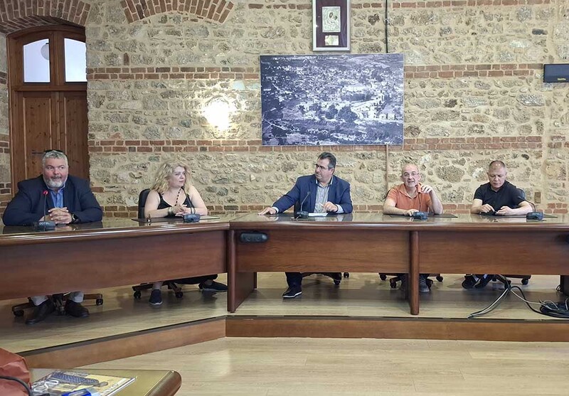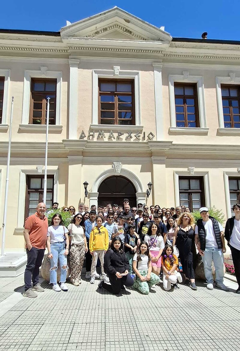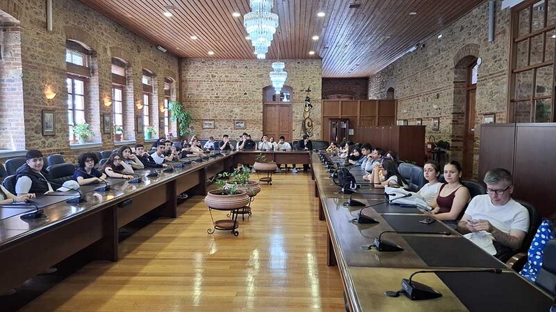 Στη συνέχεια, μετέβησαν στο Δημαρχείο της πόλης, όπου τους υποδέχθηκαν εκ μέρους του Δημάρχου κ. Κων/νου Βοργιαζίδη, ο Αντιδήμαρχος καθαριότητας, ανακύκλωσης, περιβάλλοντος και πολιτικής προστασίας κ. Βασίλης Παπαδόπουλος και ο Αντιδήμαρχος τουρισμού κ. Λάζαρος Ασλανίδης. Στην αίθουσα του Δημοτικού Συμβουλίου, ο κ. Παπαδόπουλος καλωσόρισε την ΠΜΓΣ (Πατριαρχική Μεγάλη του Γένους Σχολή), τονίζοντας τους δεσμούς με την Πόλη και την τιμή να φιλοξενείται το αρχαιότερο ελληνικό εκπαιδευτικό ίδρυμα στον κόσμο. Ακολούθως, ο Σχολάρχης κ. Δημήτριος Ζώτος ευχαρίστησε για τη φιλοξενία και την ευκαιρία να γνωρίσει η ΠΜΓΣ τη γη του Μ. Αλεξάνδρου και τα χνάρια του Αποστόλου Παύλου και ο κ. Ασλανίδης αναφέρθηκε στην ιστορική αξία της Βέροιας, μιας αρχαίας πόλης, εξαιρετικά σπουδαίας και χτισμένης σε τέσσερις φάσεις. Επίσης, η κ. Ολυμπία Μπέτσα, η Βεροιώτισσα φιλόλογος, που εδώ και τέσσερα χρόνια είναι αποσπασμένη στην ΠΜΓΣ, εξέφρασε τις ευχαριστίες της και τόνισε με συγκίνηση τη σημασία της έλευσης της ΠΜΓΣ στην πόλη της και στο σχολείο όπου μαθήτευσε η ίδια (νυν Δημαρχείο). Στο τέλος της επίσκεψης, ανταλλάχθηκαν αναμνηστικά δώρα μεταξύ του σχολείου και του Δήμου Βέροιας.
