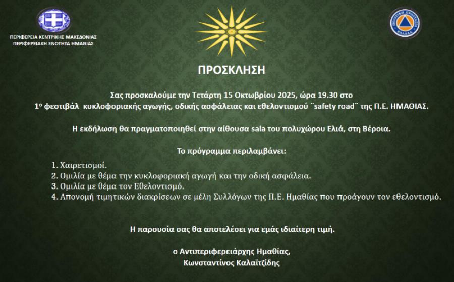 Σας προσκαλούμε την Τετάρτη 15 Οκτωβρίου 2025, ώρα 19.30 στο 1ο φεστιβάλ κυκλοφοριακής αγωγής, οδικής ασφάλειας και εθελοντισμού ¨safety road¨ της Π.Ε. ΗΜΑΘΙΑΣ. Η εκδήλωση θα πραγματοποιηθεί στην αίθουσα sala του πολυχώρου Ελιά, στη Βέροια.