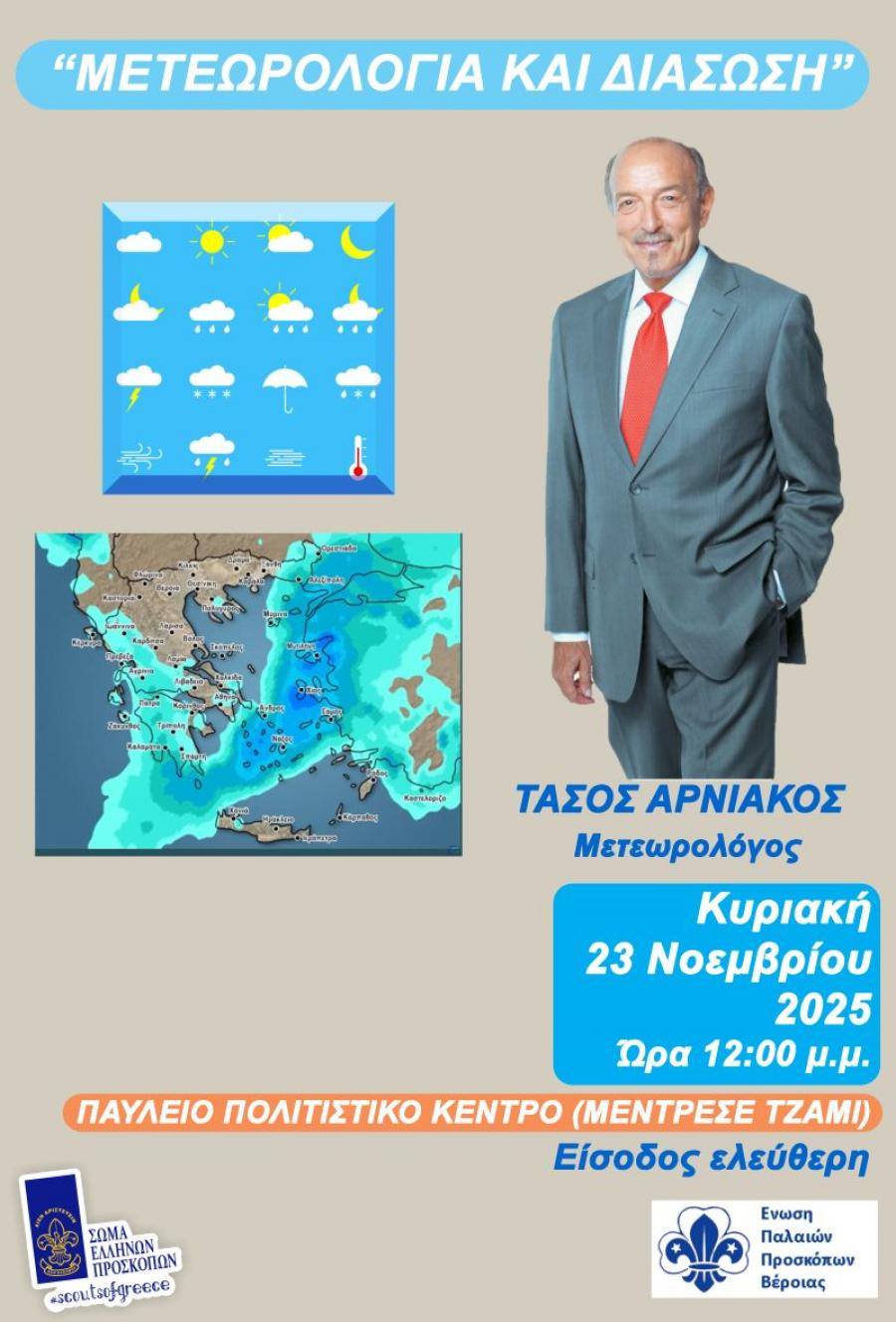 Η Ένωση Παλαιών Προσκόπων Βέροιας σας προσκαλεί την Κυριακή 23 Νοεμβρίου 2025 στο Παύλειο Πολιτιστικό Κέντρο - Μεντρεσέ Τζαμί και ώρα 12:00 μ.μ. να παρακολουθήσετε μια εξειδικευμένη παρουσίαση με θέμα: «Μετεωρολογία και Διάσωση» όπου ο δημοφιλής μετεωρολόγος και Αρχηγός Εκπαιδευτής του Σώματος Ελλήνων Προσκόπων κ.Τάσος Αρνιακός θα αναλύσει την συμβολή της μετεωρολογίας στην διάσωση αλλά και την μεταξύ τους πολύτιμη σχέση μπροστά σε μια δύσκολη κατάσταση.