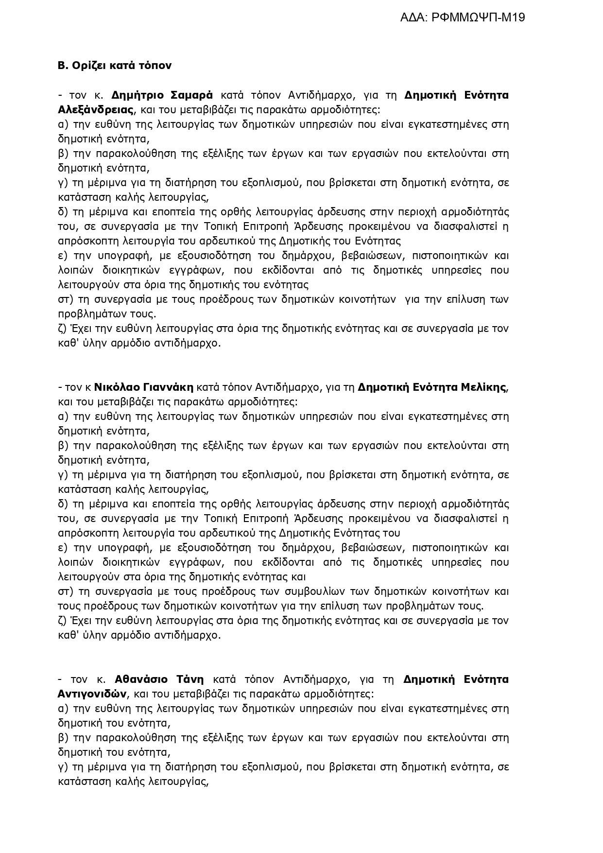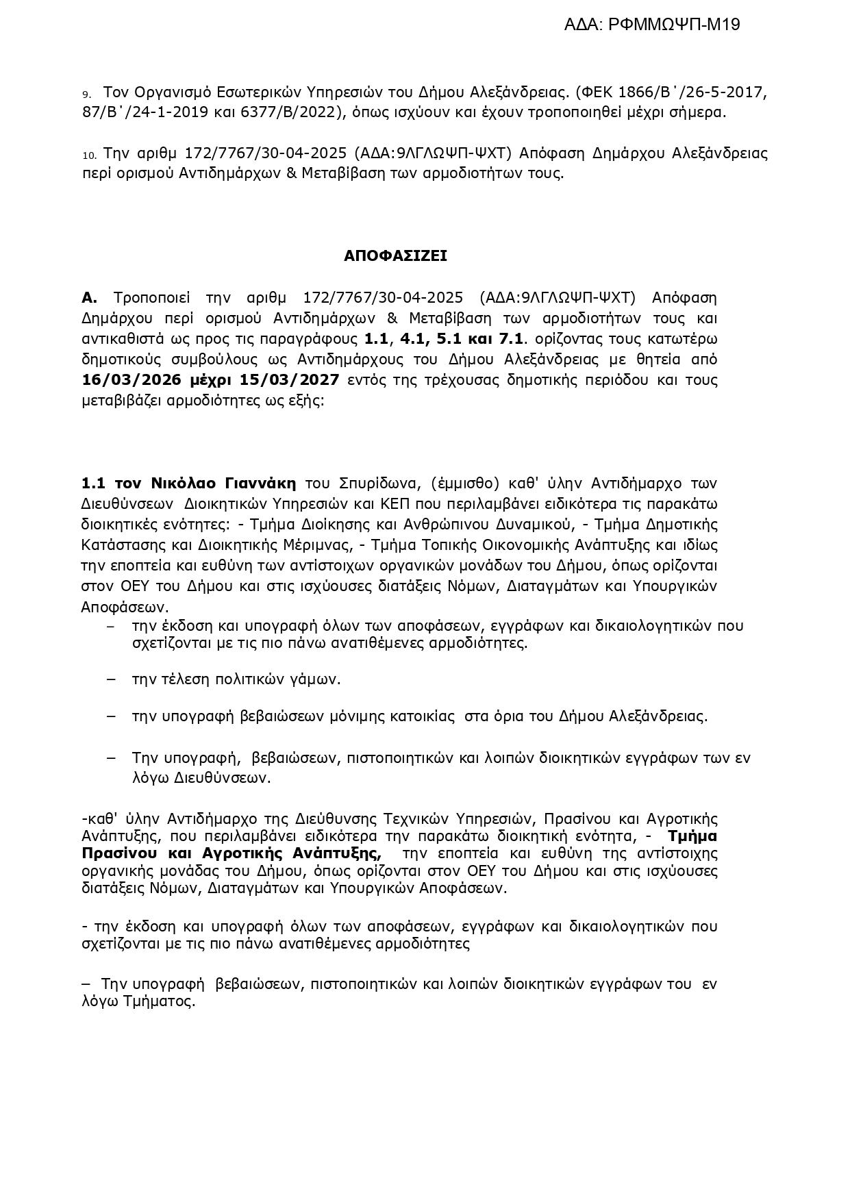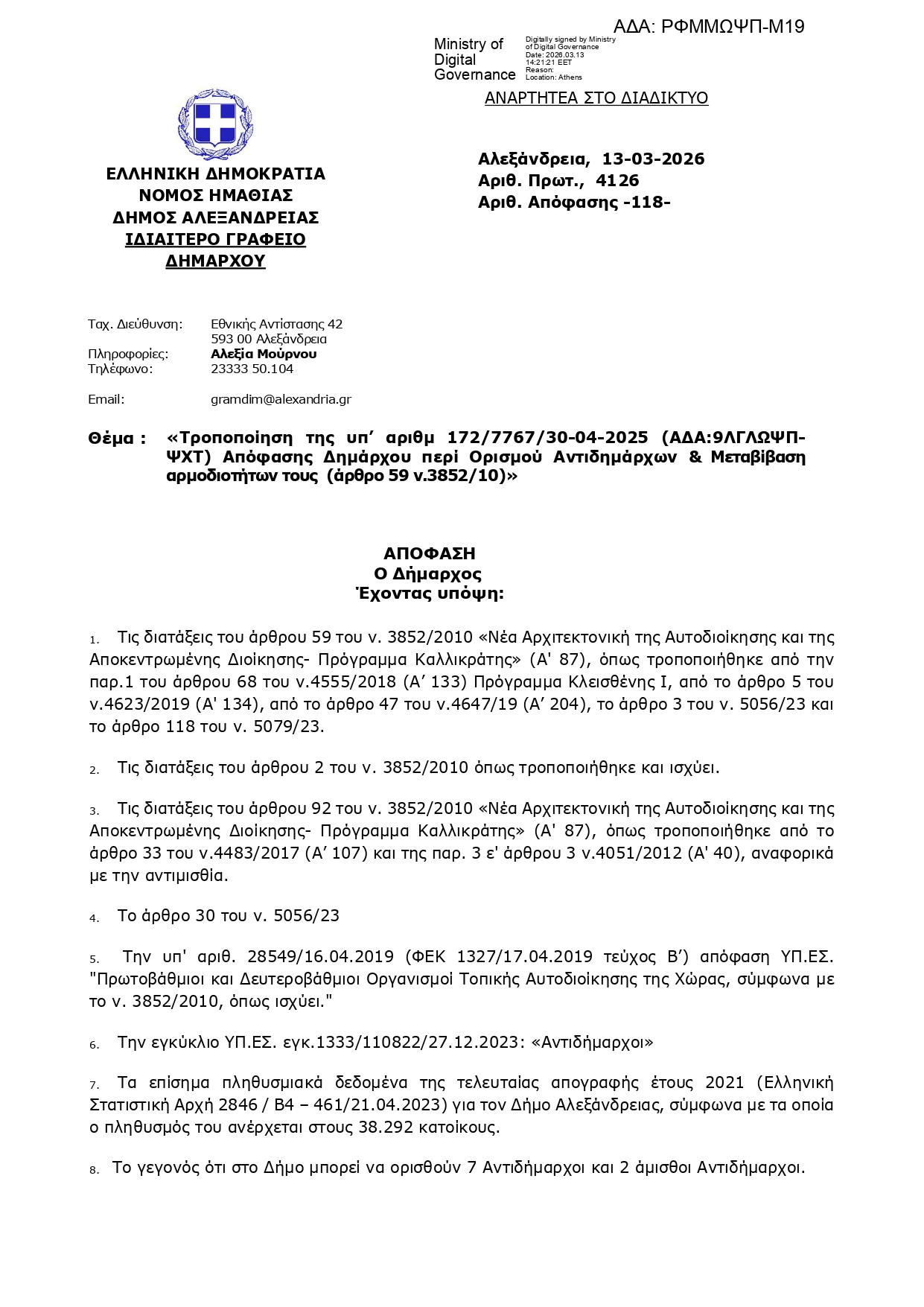 Ανακοινώνεται από το Γραφείο Δημάρχου του Δήμου Αλεξάνδρειας ότι με σημερινή απόφαση του Δημάρχου Παναγιώτη Γκυρίνη, με αρ. πρωτ. 4126/118/13-03-2026, ορίζονται οι νέοι Αντιδήμαρχοι του Δήμου Αλεξάνδρειας, με θητεία από 16 Μαρτίου 2026 μέχρι 15 Μαρτίου 2027.