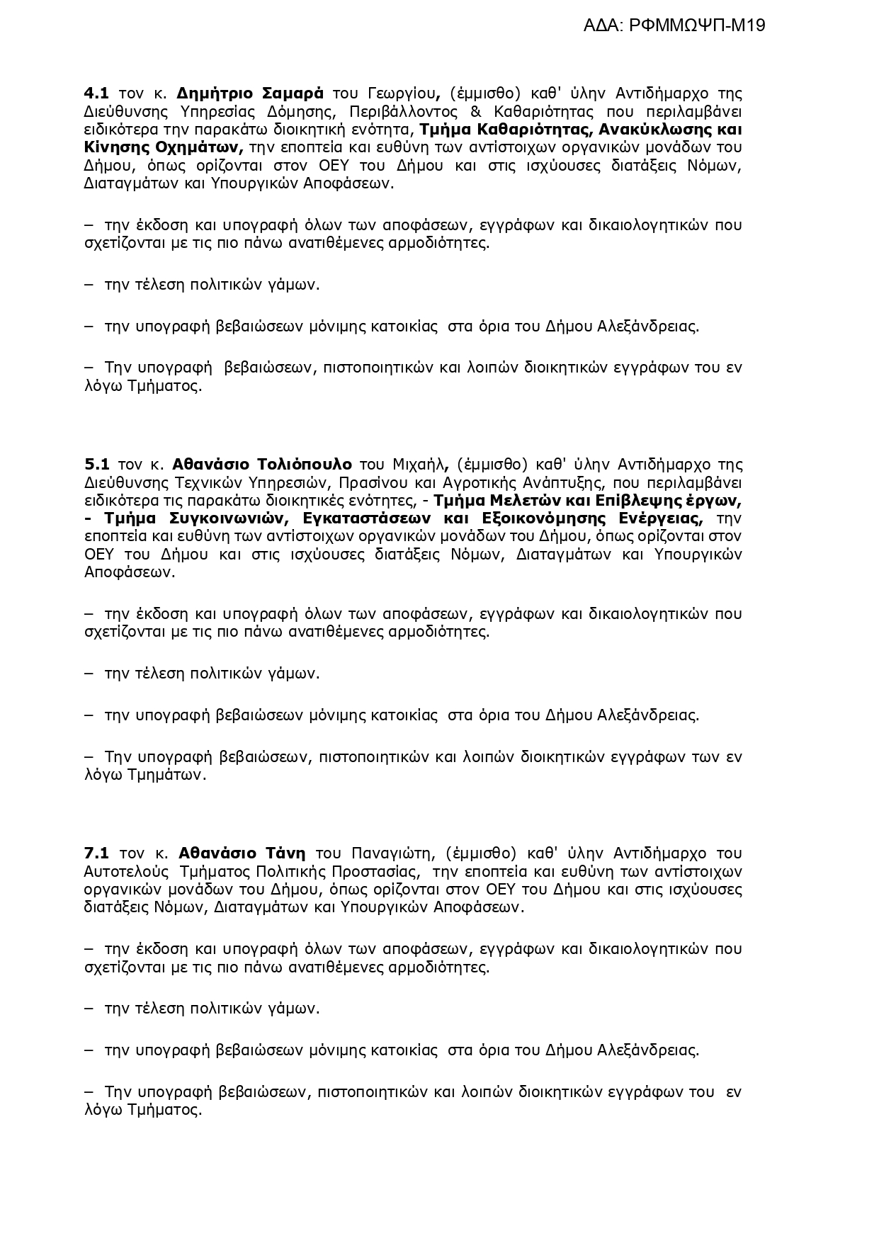 Τα ονόματα των δημοτικών συμβούλων που ορίστηκαν ως Αντιδήμαρχοι, οι περιοχές ευθύνης τους, όπως και οι συγκεκριμένες αρμοδιότητες που μεταβιβάστηκαν σε αυτούς, περιλαμβάνονται ως παρακάτω: