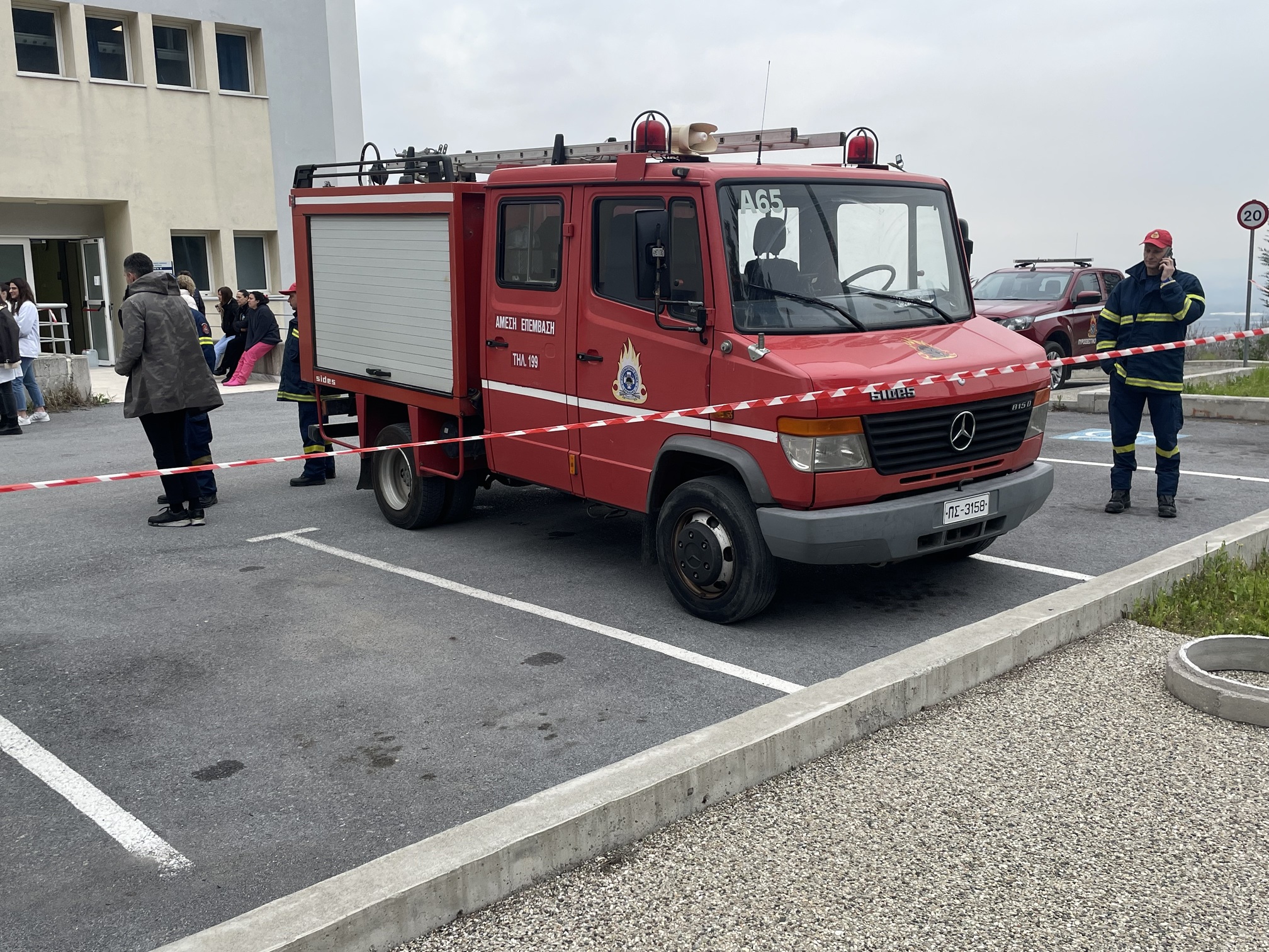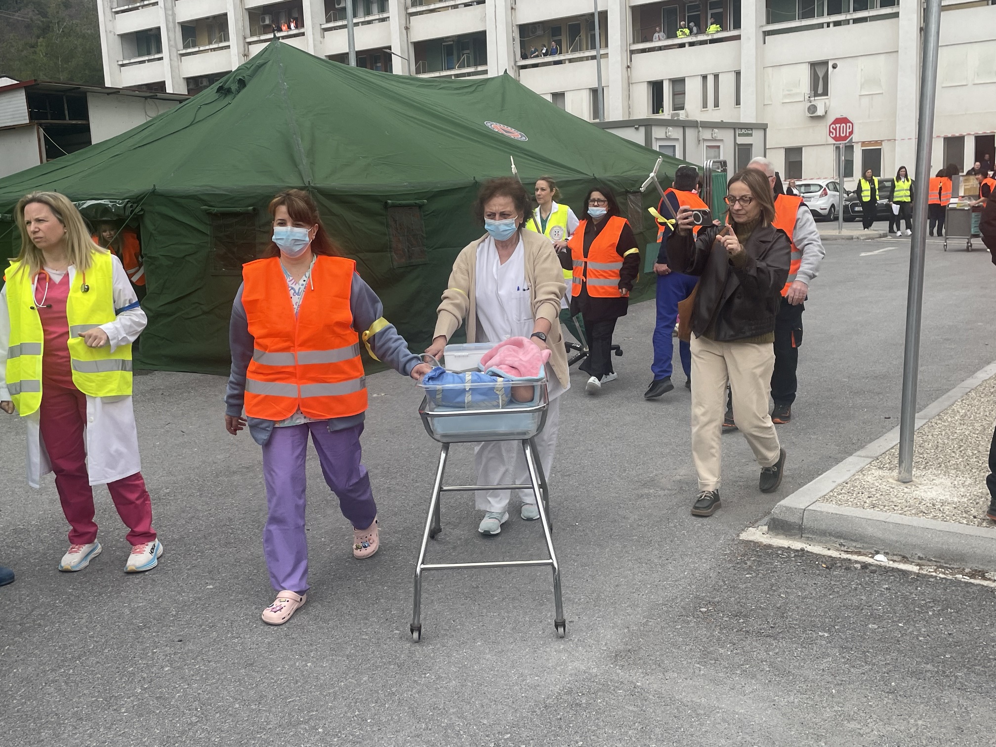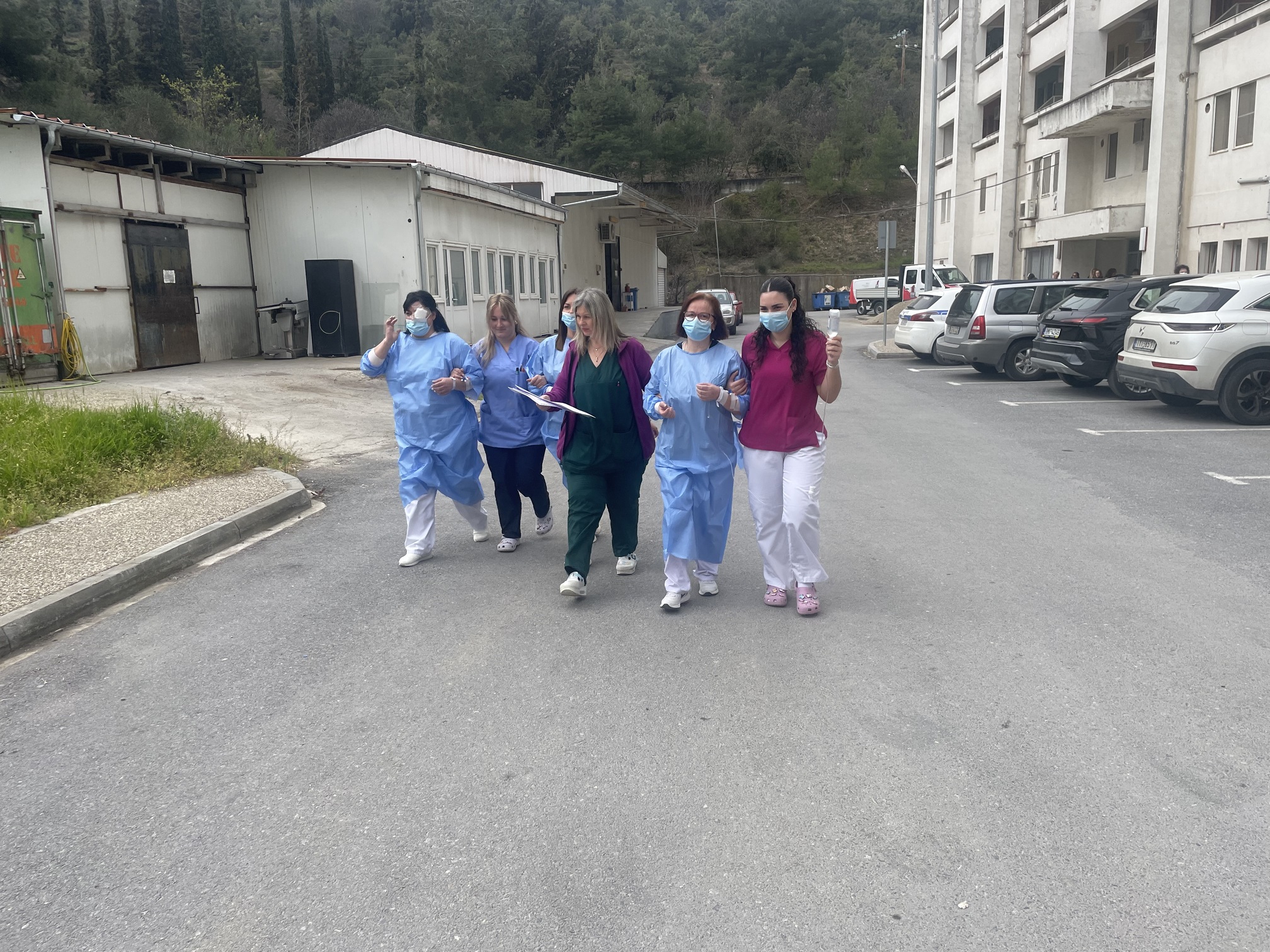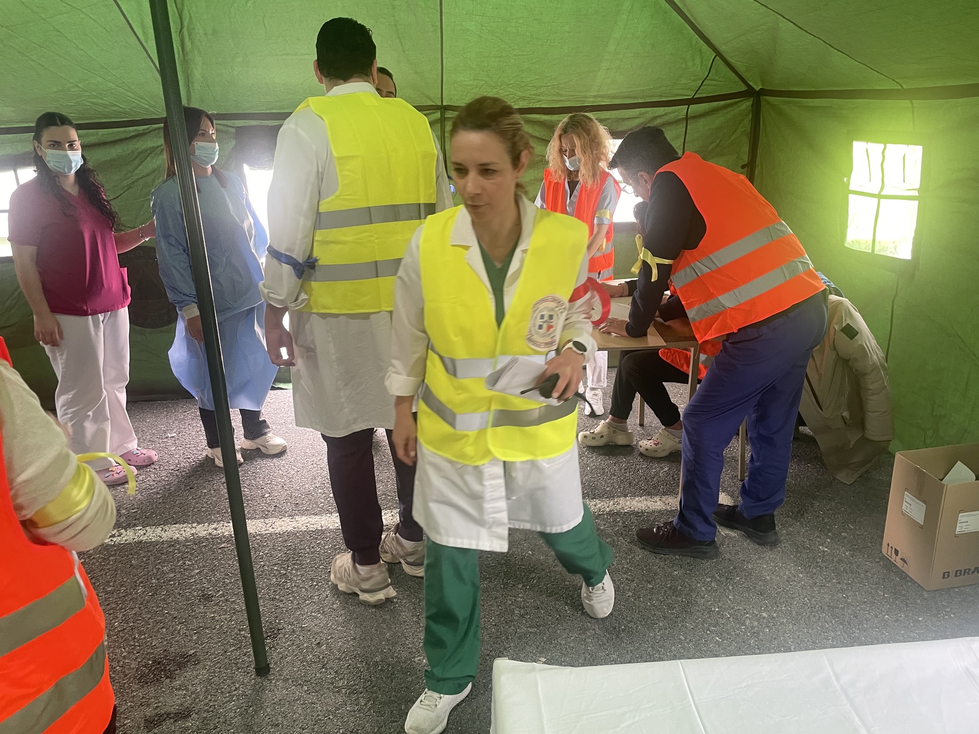 Παράλληλα, στον προαύλιο χώρο του νοσοκομείου αναπτύχθηκε προσωρινός σκηνικός καταυλισμός με μονάδες διαλογής (triage) και νοσηλείας, σύμφωνα με τα διεθνή πρότυπα διαχείρισης μαζικών καταστροφών. Εκεί πραγματοποιήθηκε η υποδοχή και κατηγοριοποίηση των περιστατικών με βάση τη βαρύτητά τους.