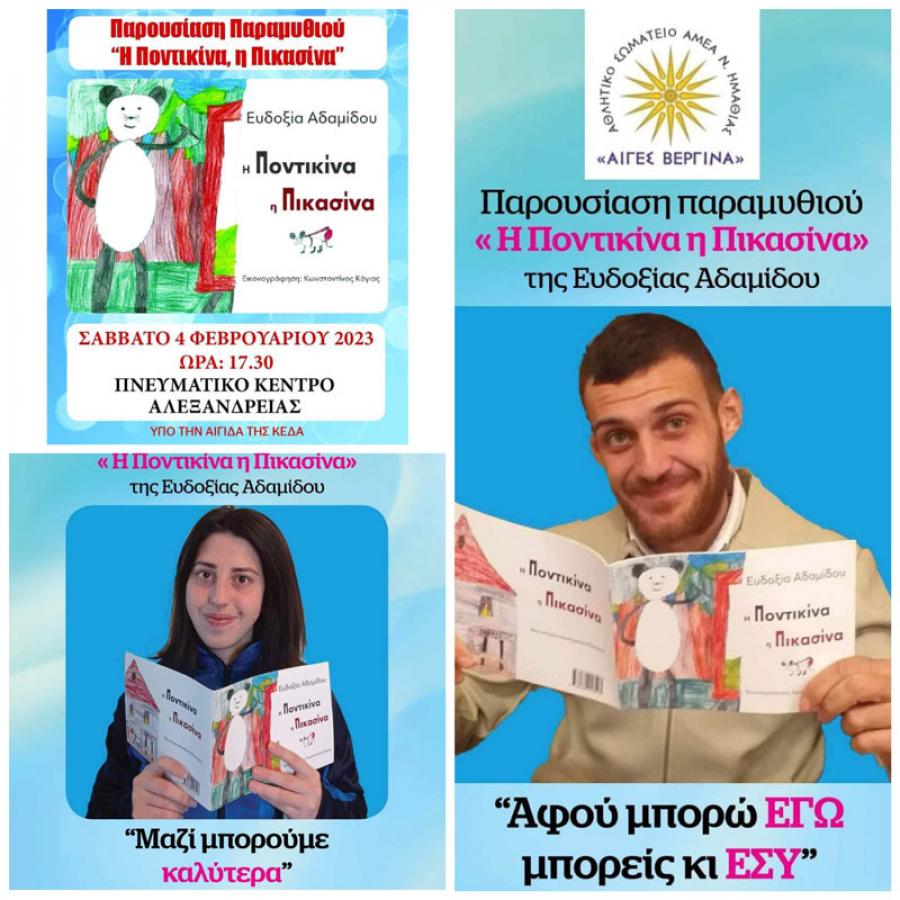 Το Αθλητικό Σωματείο ΑμεΑ Ν.Ημαθίας «ΑΙΓΕΣ ΒΕΡΓΙΝΑ» διοργανώνει την παρουσίαση του παραμυθιού της Αδαμίδου Ευδοξίας, ψυχολόγου – ψυχοθεραπεύτριας και επιστημονικής συνεργάτη του σωματείου μας, το Σάββατο, 4 Φεβρουαρίου 2023, στις 17:30 πμ στο Πνευματικό Κέντρο του Δήμου Αλεξάνδρειας.