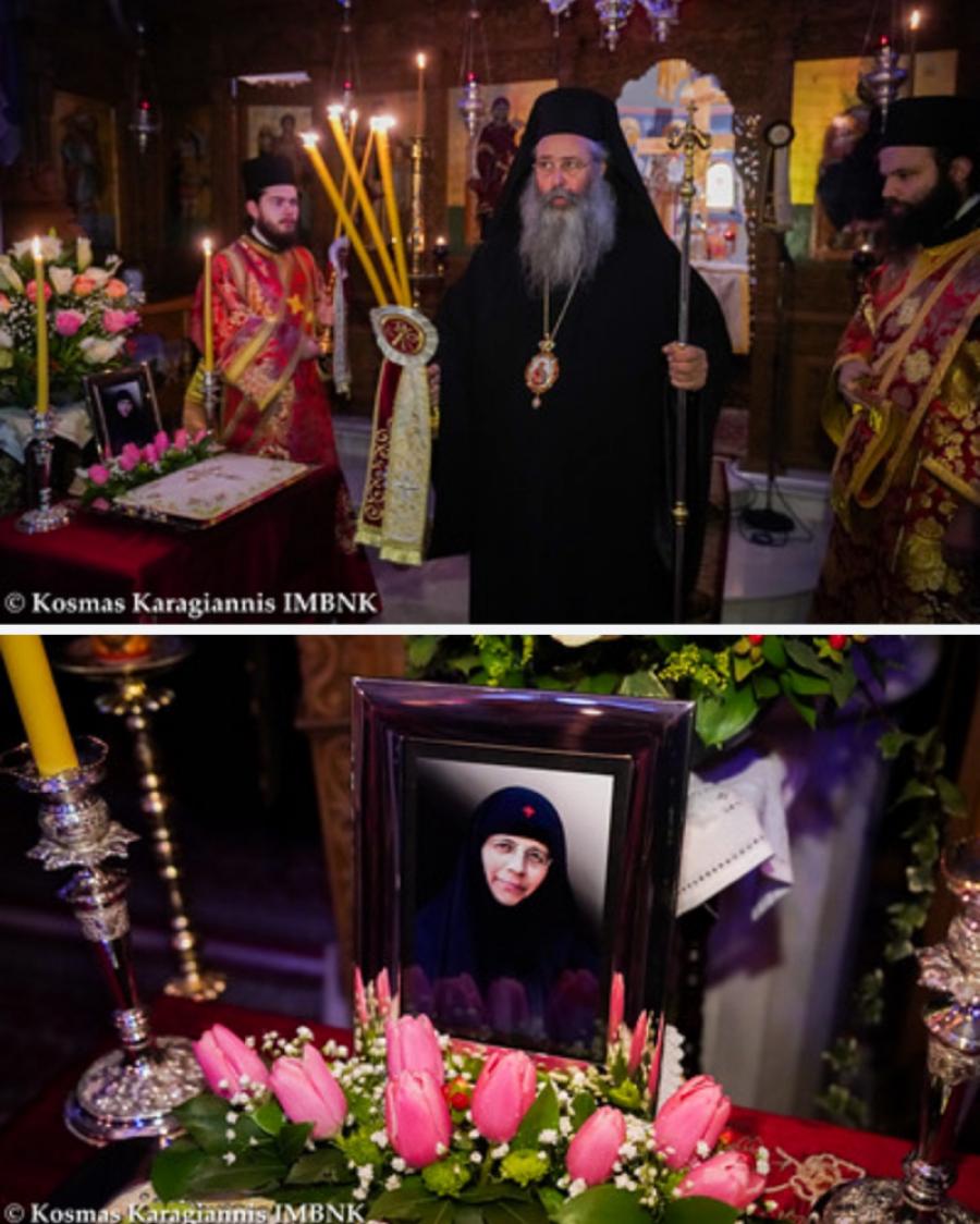 Στο Αρχιερατικό Συλλείτουργο που προηγήθηκε προεξήρχε ο Σεβασμιώτατος Μητροπολίτης Κίτρους, Κατερίνης και Πλαταμώνος κ. Γεώργιος, ο οποίος συνδεόταν με τη μακαριστή Γερόντισσα από την εποχή που υπηρετούσε ως Πρωτοσύγκελλος της Ιεράς Μητροπόλεως Βεροίας και συμμετείχε ο Ποιμενάρχης μας, Σεβασμιώτατος Μητροπολίτης Βεροίας, Ναούσης και Καμπανίας κ. Παντελεήμων, ο οποίος κήρυξε και τον θείο λόγο.