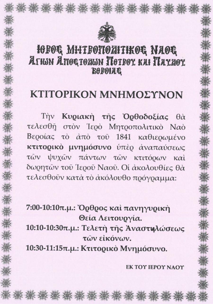 Ανακοίνωση του Μητροπολιτικού Ναού Βέροιας για το καθιερωμένο κτιτορικό μνημόσυνο