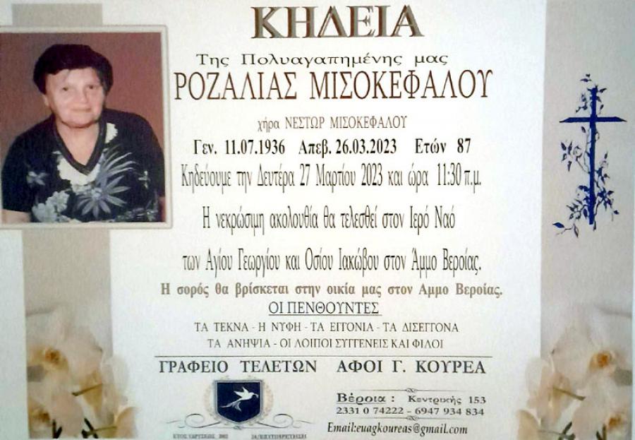 Κηδεύεται αύριο Δευτέρα 27 Μαρτίου 2023 και ώρα 11.30 το πρωί, η Ροζαλία, χήρα Νέστορα, Μισοκεφάλου, 87 ετών. Η νεκρώσιμη ακολουθία θα τελεσθεί στον Ιερό Ναό των Αγίου Γεωργίου και Οσίου Ιακώβου στην Άμμο Δήμου Βέροιας.