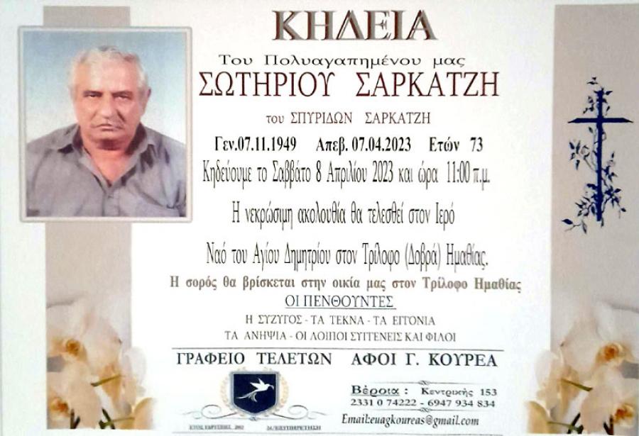 Κηδεύεται αύριο Σάββατο 08 Απριλίου 2023 και ώρα 11.00 το πρωί ο Σωτήριος, Σπυρίδωνος, Σαρκατζής, 73 ετών. Η νεκρώσιμη ακολουθία θα τελεσθεί στον Ιερό Ναό Αγίου Δημητρίου στον Τρίλοφο Δήμου Βέροιας. Ο σορός βρίσκεται στην οικία μας στον Τρίλοφο.