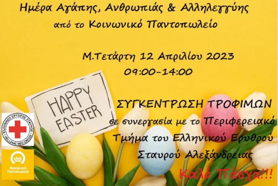 Ο Δήμος Αλεξάνδρειας μέσω του Κοινωνικού Παντοπωλείου της Διεύθυνσης Κοινωνικής Προστασίας Παιδείας και Πολιτισμού του Δήμου Αλεξάνδρειας, σε συνεργασία με το Περιφερειακό Τμήμα του Ελληνικού Ερυθρού Σταυρού, εν όψει των άγιων ημερών του Πάσχα, συνδιοργανώνουν δράση με σκοπό τη συγκέντρωση τροφίμων για τους συμπολίτες μας που στερούνται βασικών ειδών διατροφής με τίτλο “Ημέρα Αγάπης, Ανθρωπιάς και Αλληλεγγύης».