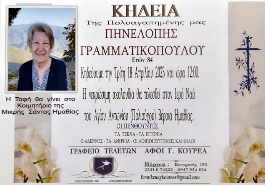 Κηδεύεται αύριο Τρίτη 18 Απριλίου 2023 και ώρα 12.00 το μεσημέρι η Πηνελόπη Γραμματικοπούλου, 84 ετών. Η νεκρώσιμη ακολουθία θα τελεσθεί στον Ιερό Ναό Αγίου Αντωνίου (Πολιούχος) στη Βέροια.