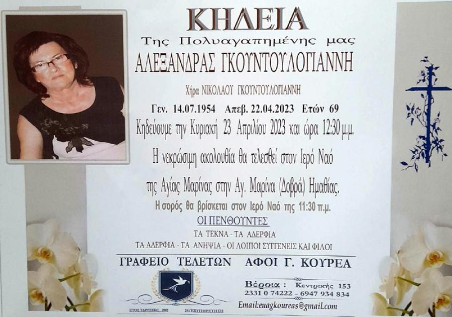 Κηδεύεται αύριο Κυριακή 23 Απριλίου 2023 και ώρα 12.30 το μεσημέρι η Αλεξάνδρα, χήρα Νικολάου, Γκουντουλογιάννη, 69 ετών. Η νεκρώσιμη ακολουθία θα τελεσθεί στον Ιερό Ναό Αγίας Μαρίνας στην Αγία Μαρίνα Δήμου Βέροιας.